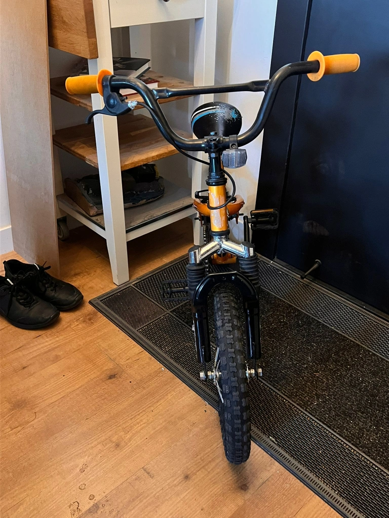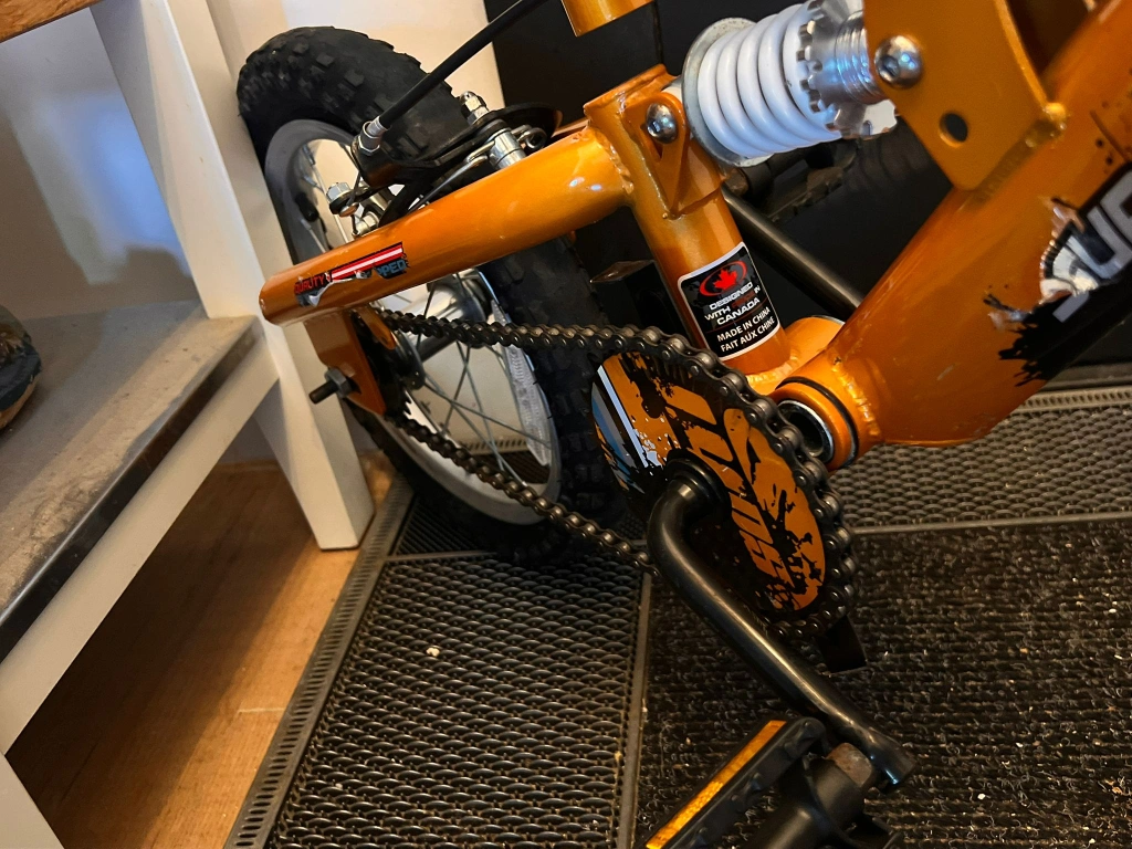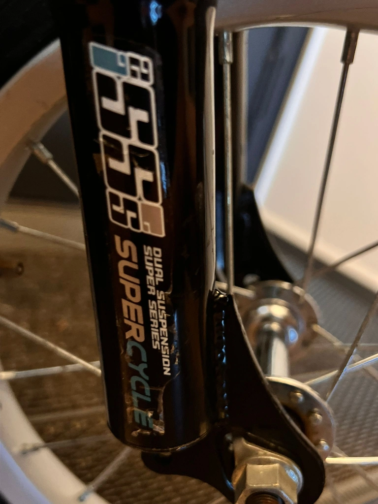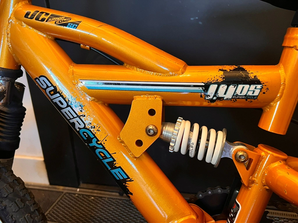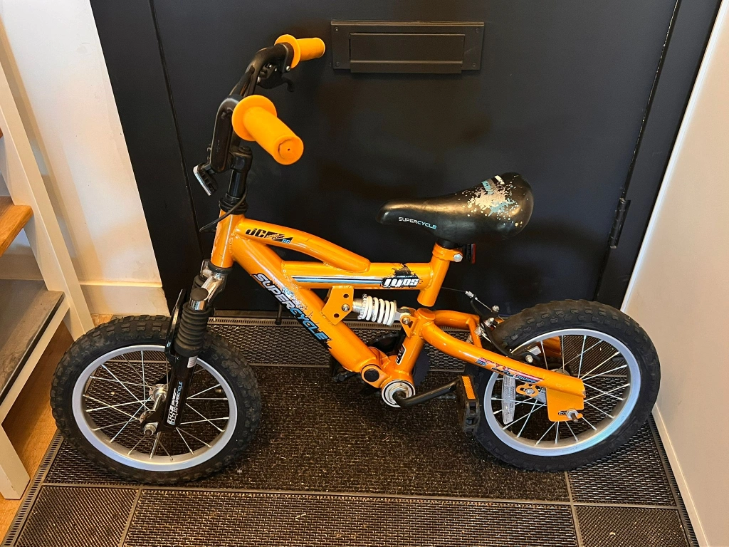 Selling a Supercycle Junior Comp bike, a full-suspension mountain bike designed for children, indicated by the front and rear suspension. It's in great condition and ready for a new rider. Perfect for kids who are learning to ride or want a fun bike for cruising around the neighbourhood