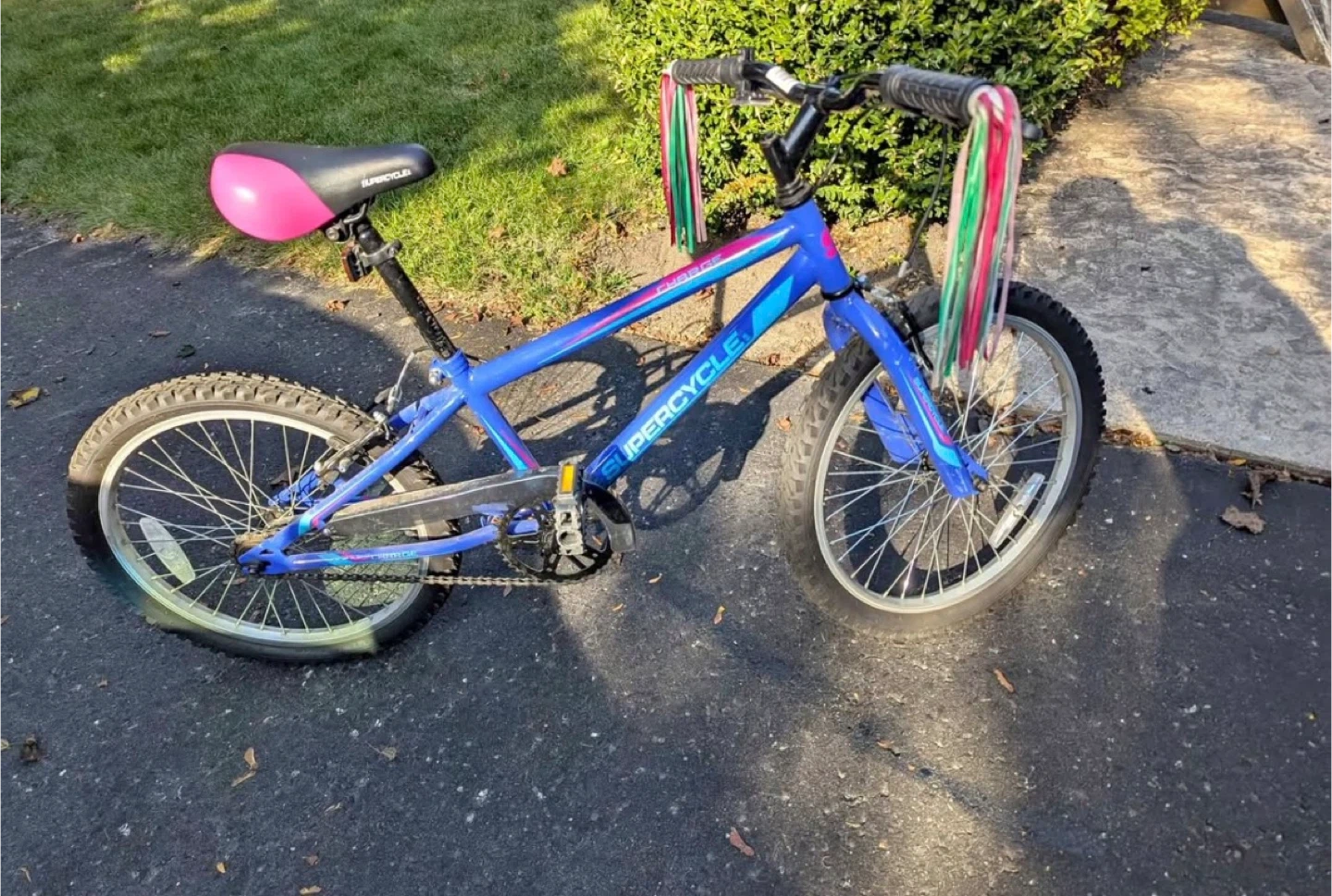 20Selling a Supercycle kids' bike in blue with a pink seat! It has some colourful ribbons on the handlebars. The tires look like they need some air, but otherwise it's ready for a new home!