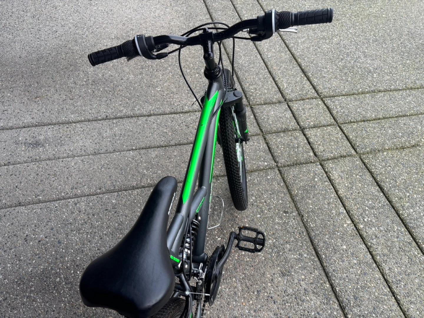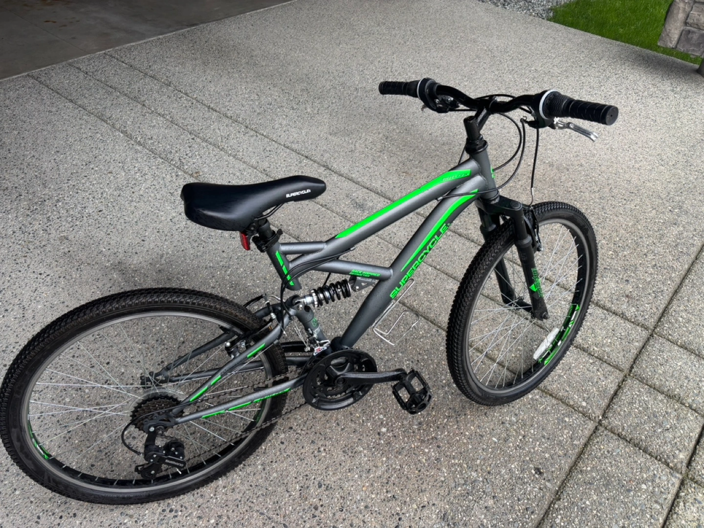 Grey and green mountain bike. Dual suspension. 24-inch wheels. Good condition. Minor wear.