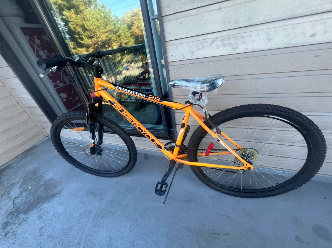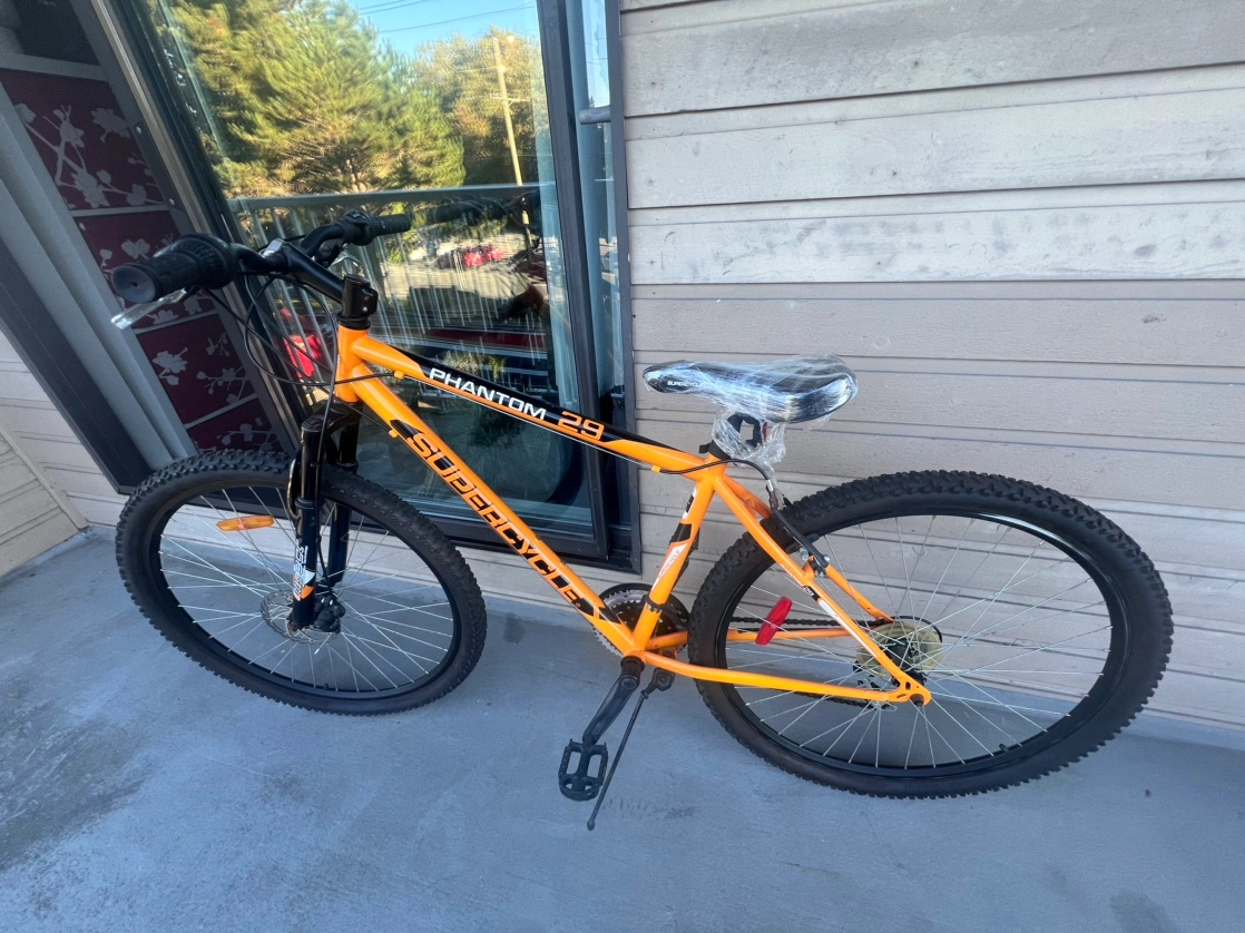 43Supercycle Phantom 29" Hardtail Mountain Bike with 18" high-tensile steel frame. 29" tires. 21-speed. Shimano Revo grip shifters. Shimano derailleurs. Front disc brake. Rear alloy V-brake. Suspension fork. Alloy rims. Pick Up in Richmond