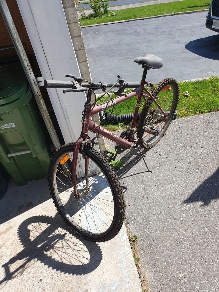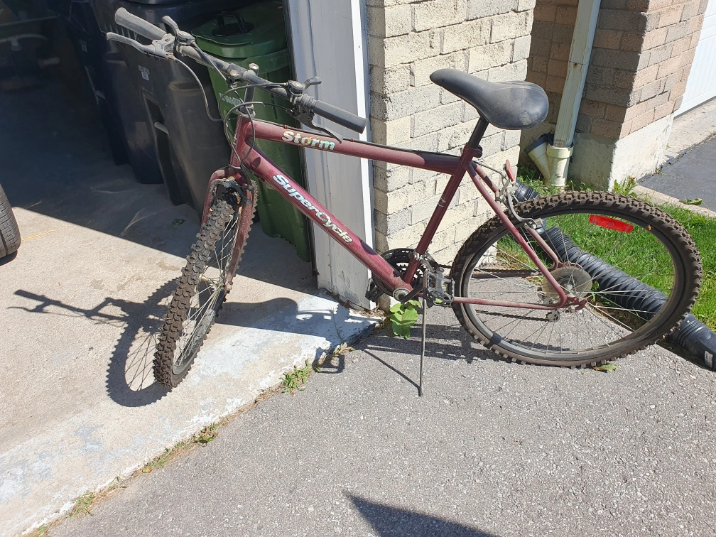Selling a Supercycle Storm mountain bike. It's a bit dusty but still in good working condition! Great for trails or just getting around town. It's been sitting in the garage for a while so there is some rusting and the tires need some air but it's a good bike once cleaned up.
