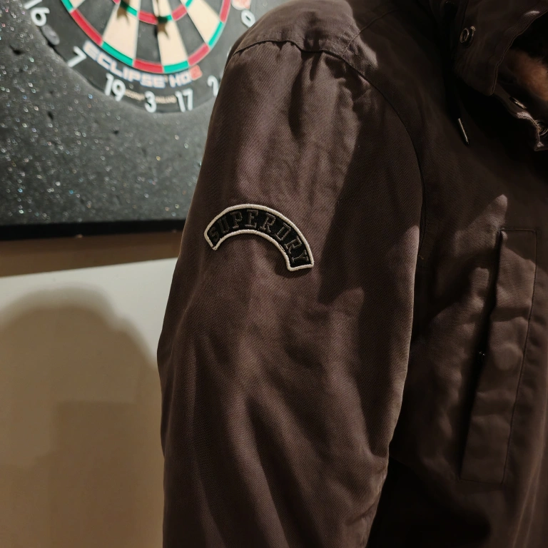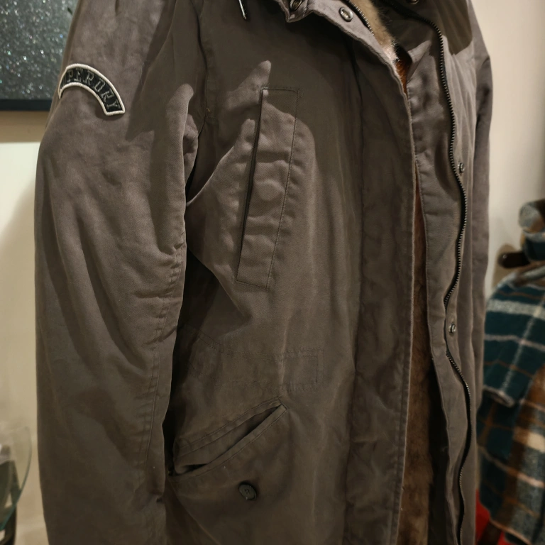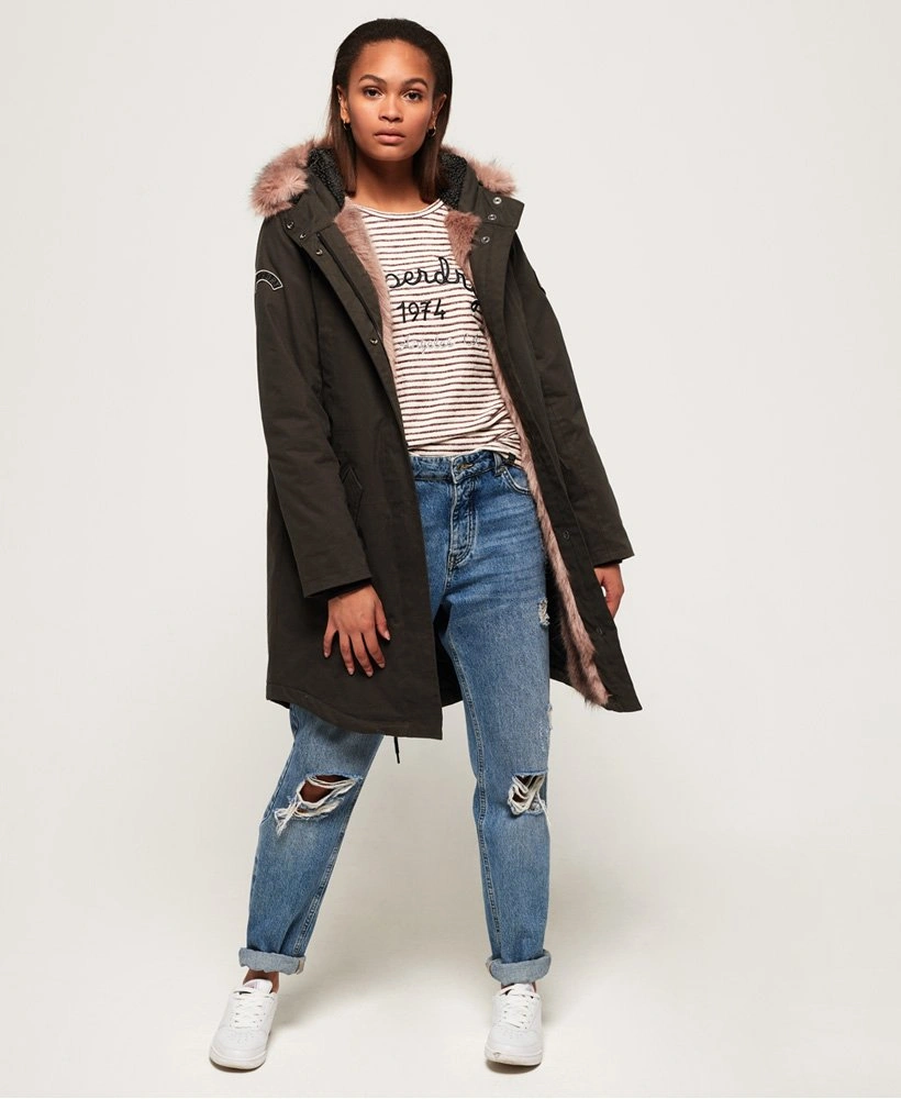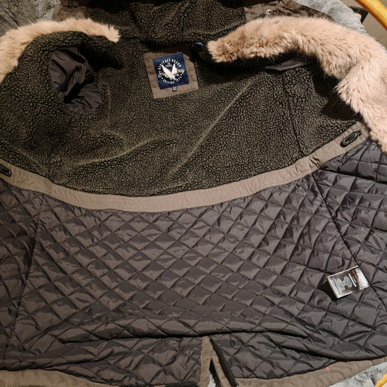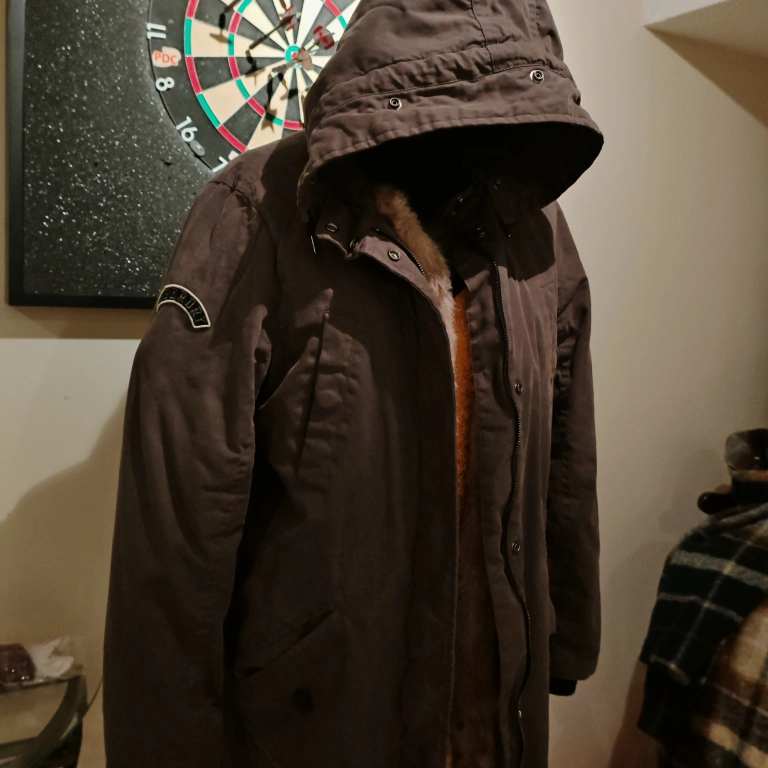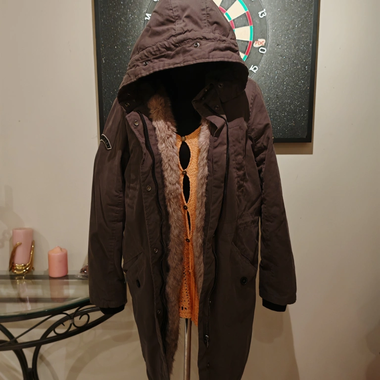 68In good condition. But lost faux fur trim on the hood. Attention : lost faux fur trim on the hood US 8 Superdry women’s Frankie faux fur lined parka jacket. Cosy up in style this season with the Frankie faux fur lined parka. a fleece upper lining, a quilted lower lining and zip and popper fastening. The parka also features four front pockets, and the adjustable waist means you can get your perfect fit. The Frankie faux fur lined parka is completed with Superdry logo badges on the sleeves and further faux fur trim detailing on the lining.