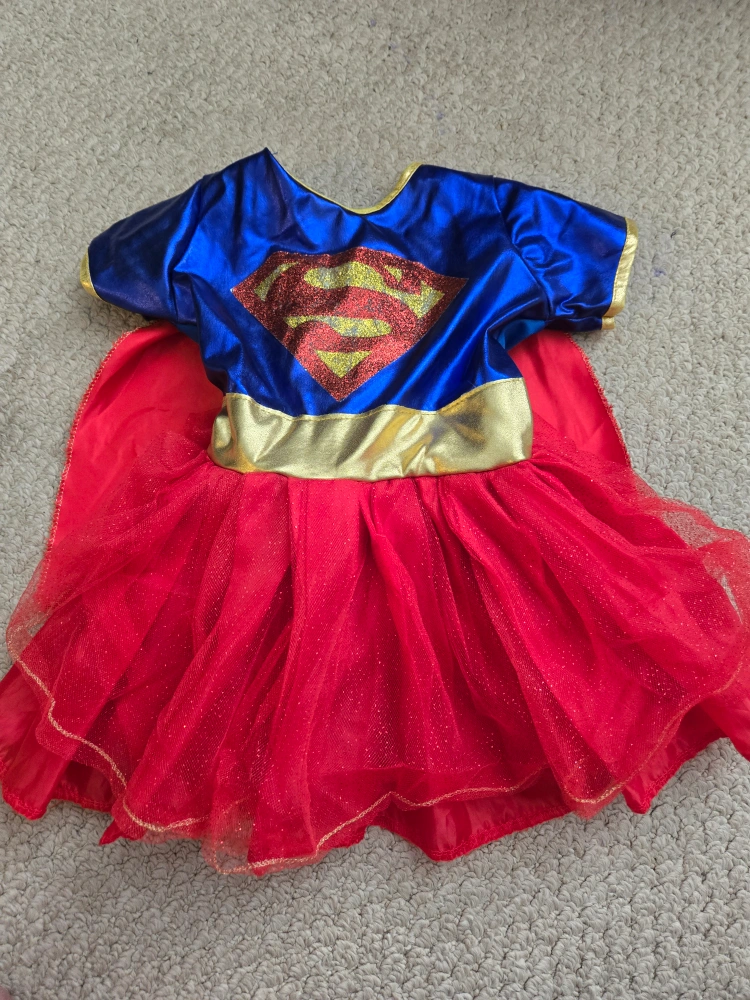 Super cute Supergirl costume dress with attached cape! The dress features a blue top with the Supergirl logo, a gold waistband, and a red tulle skirt. Perfect for dress-up or Halloween! 12-18 months
