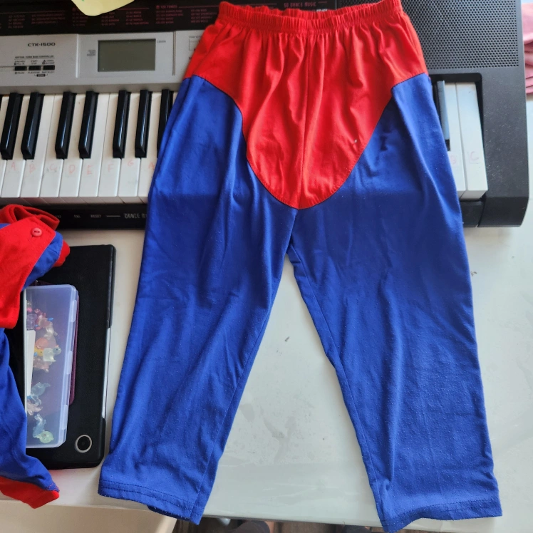 A cute Superman pajama set in size L! Perfect for your little superhero to wear to bed. The set includes a long-sleeved top with the Superman logo, matching pants, and a cape pick up