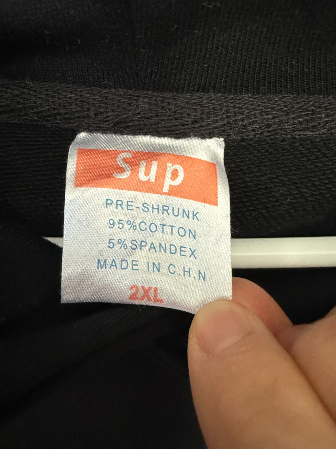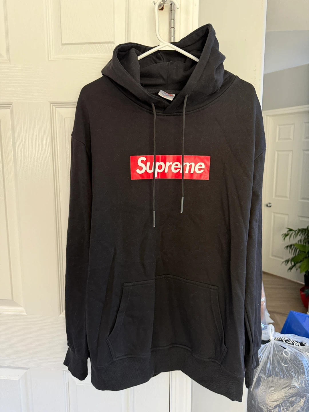 Selling a Supreme Box Logo Hoodie in black, size XXL. It's made of 95% cotton and 5% spandex. The tag indicates that it's pre-shrunk!