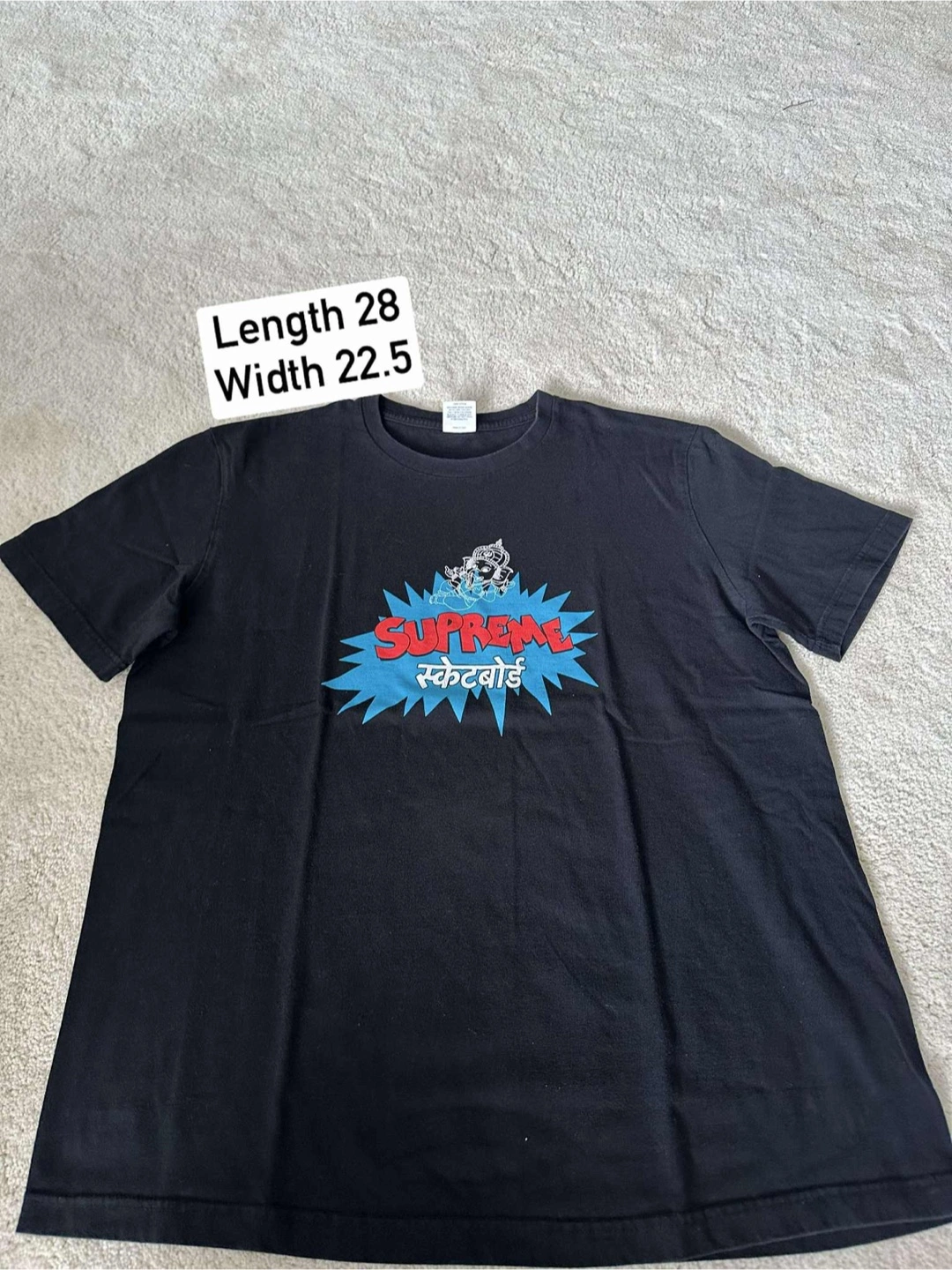 68Selling a black Supreme skateboard t-shirt. The length is 28 inches and the width is 22.5 inches. It's in great shape and ready for a new home!