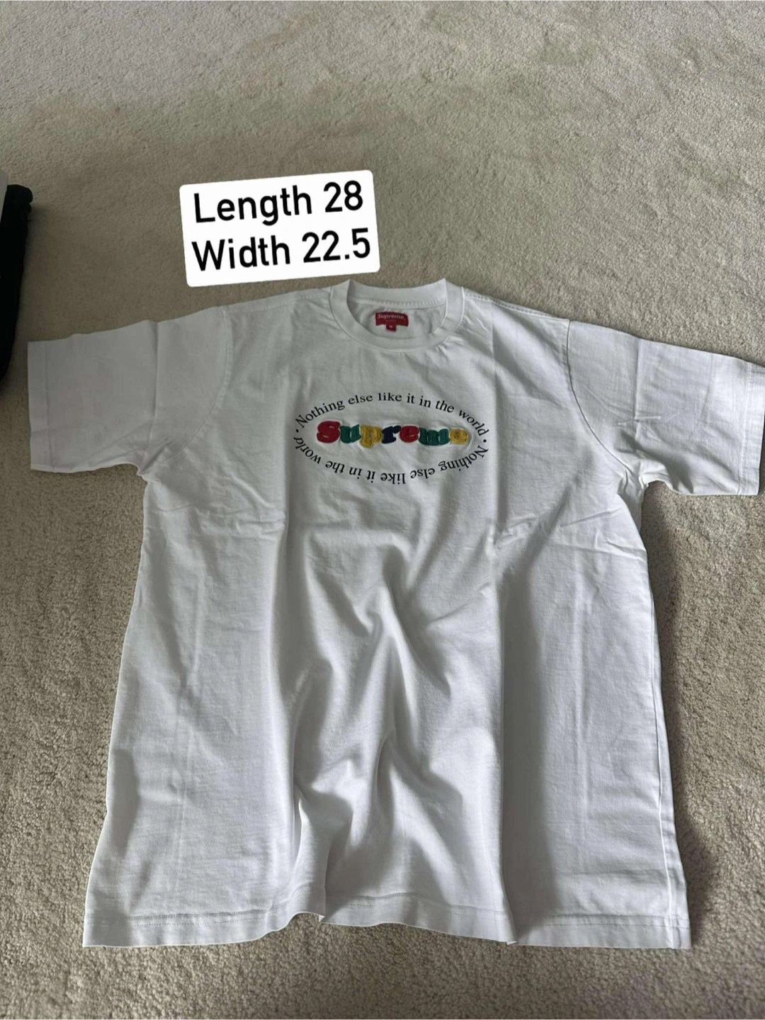68Selling a white Supreme T-shirt. It features a colourful logo design. The length is 28 inches and the width is 22.5 inches