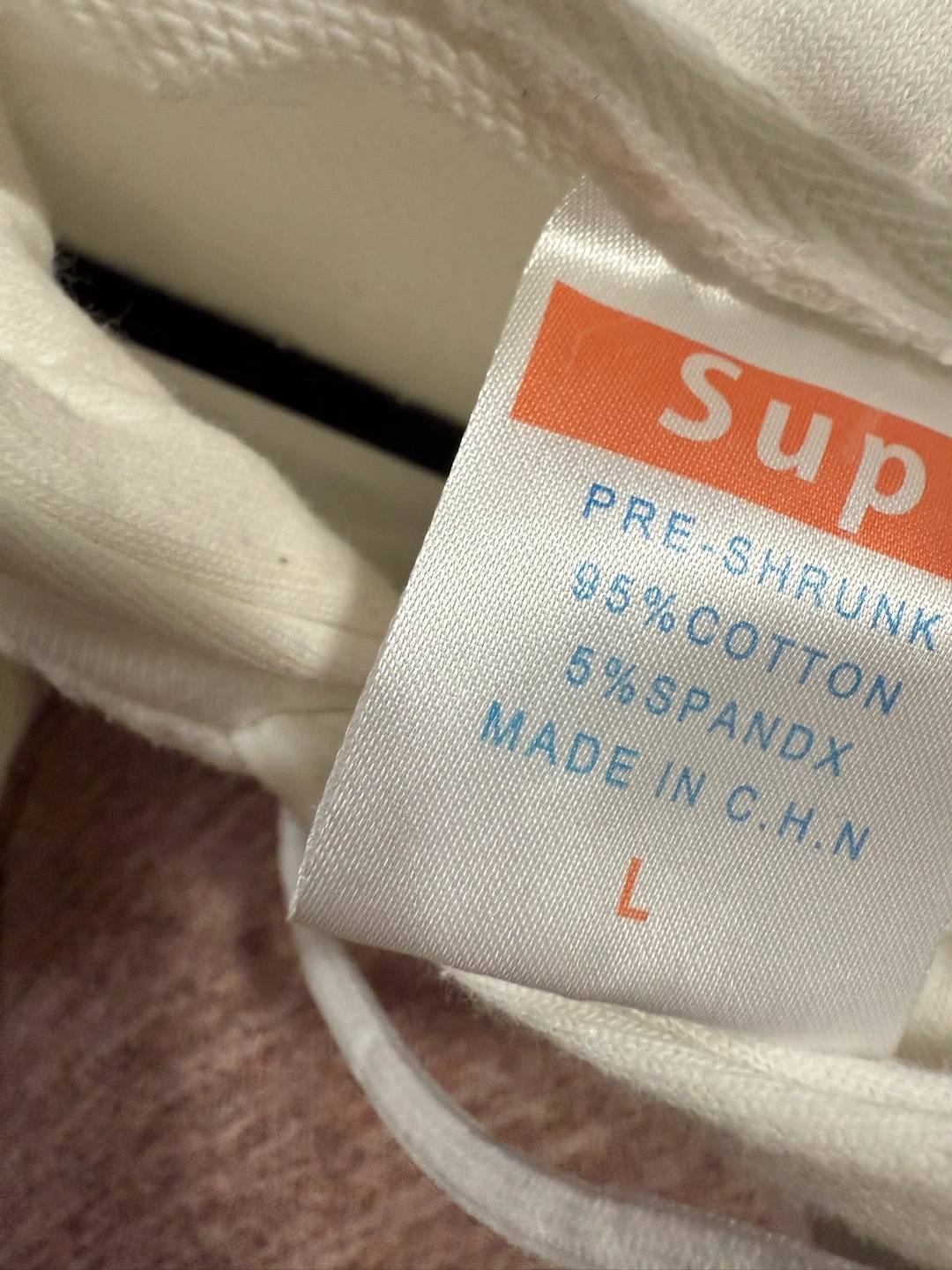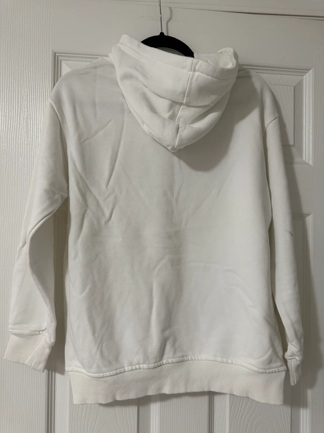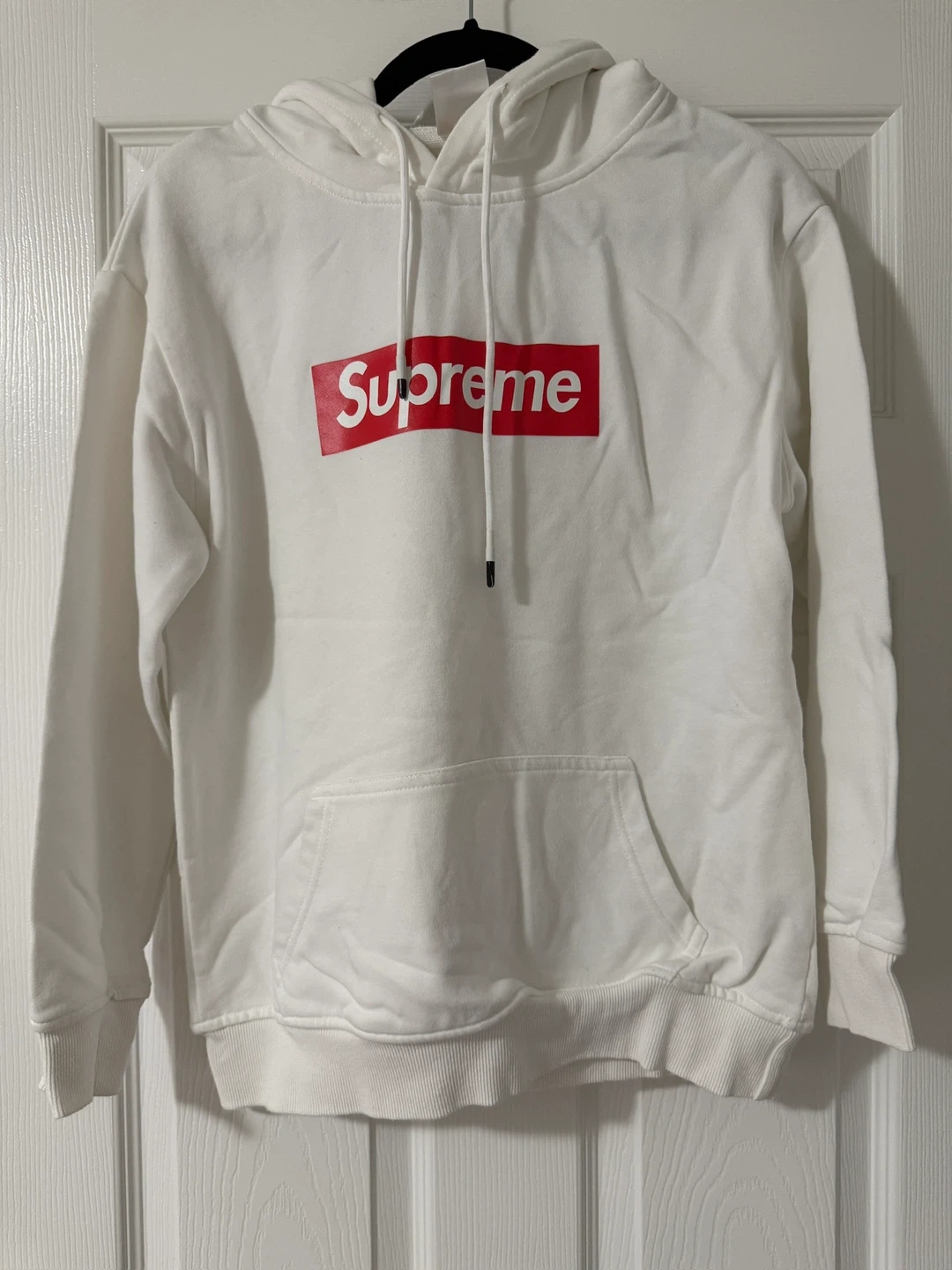 25Selling a white Supreme hoodie in size L. It's made of 95% cotton and 5% spandex, so it's nice and comfy. It has a classic box logo on the front. Perfect for staying cozy!