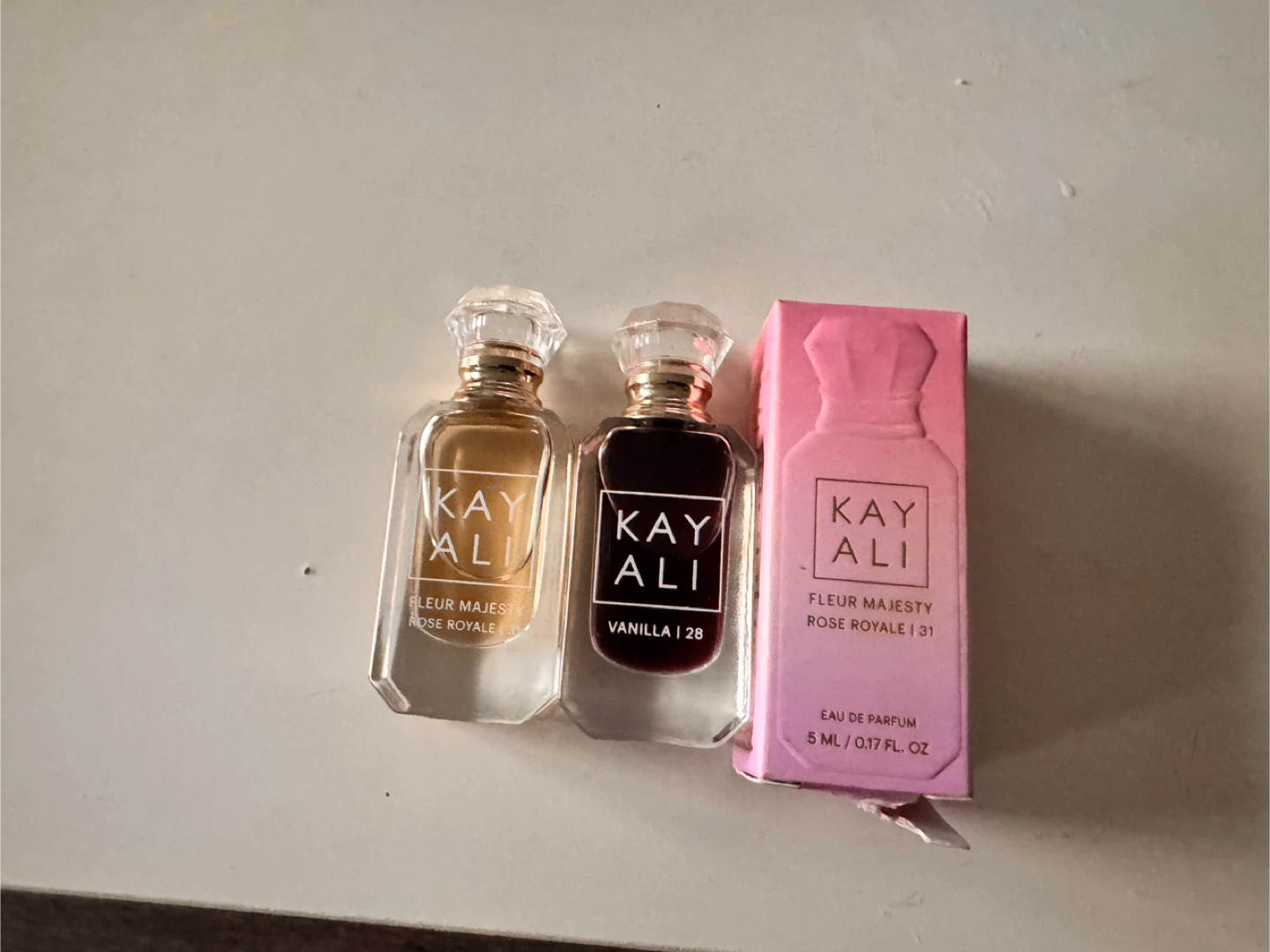 This is a set of two Kayali mini perfumes: Fleur Majesty Rose Royale | 31 (which one i used twice) and Vanilla | 28. (never used ) Each bottle contains 5 ml or 0.17 fl. oz. of eau de parfum. They're great for travel or trying out popular scents!