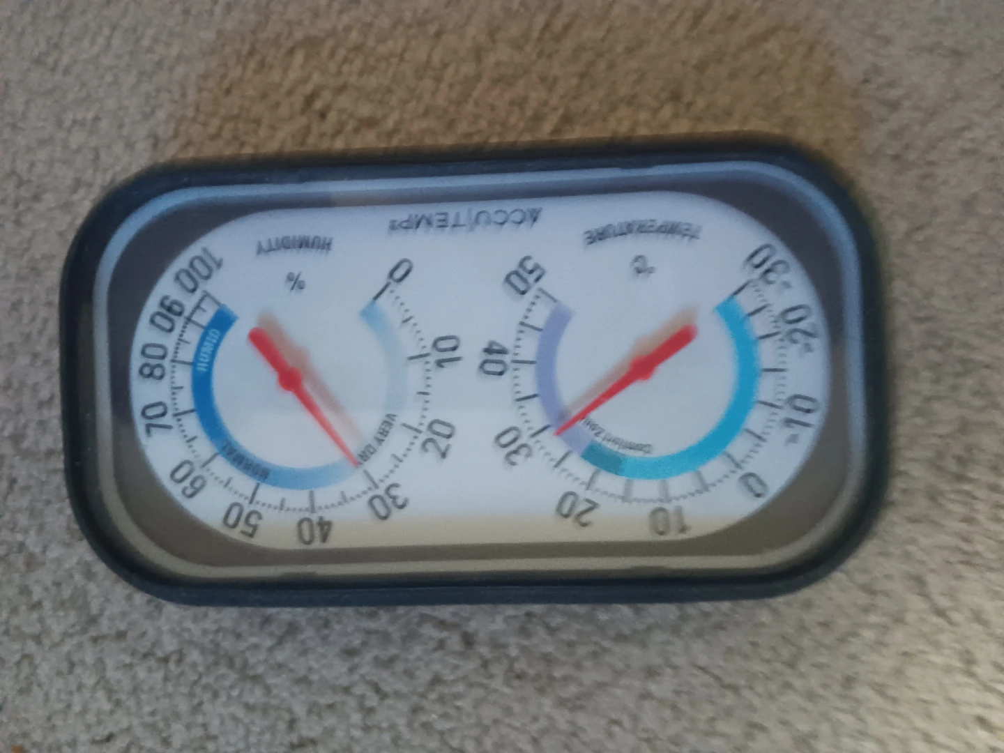 This device measures both temperature and humidity. It displays readings for temperature in Celsius and humidity in percentage. The dials show a comfort zone for both readings.
