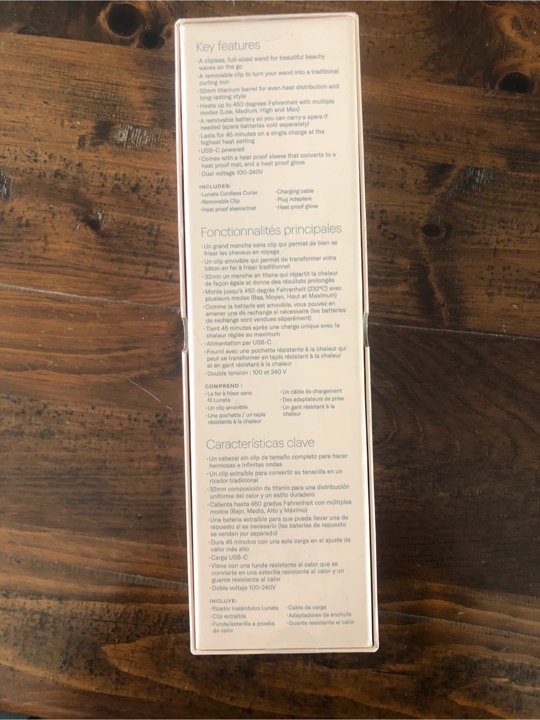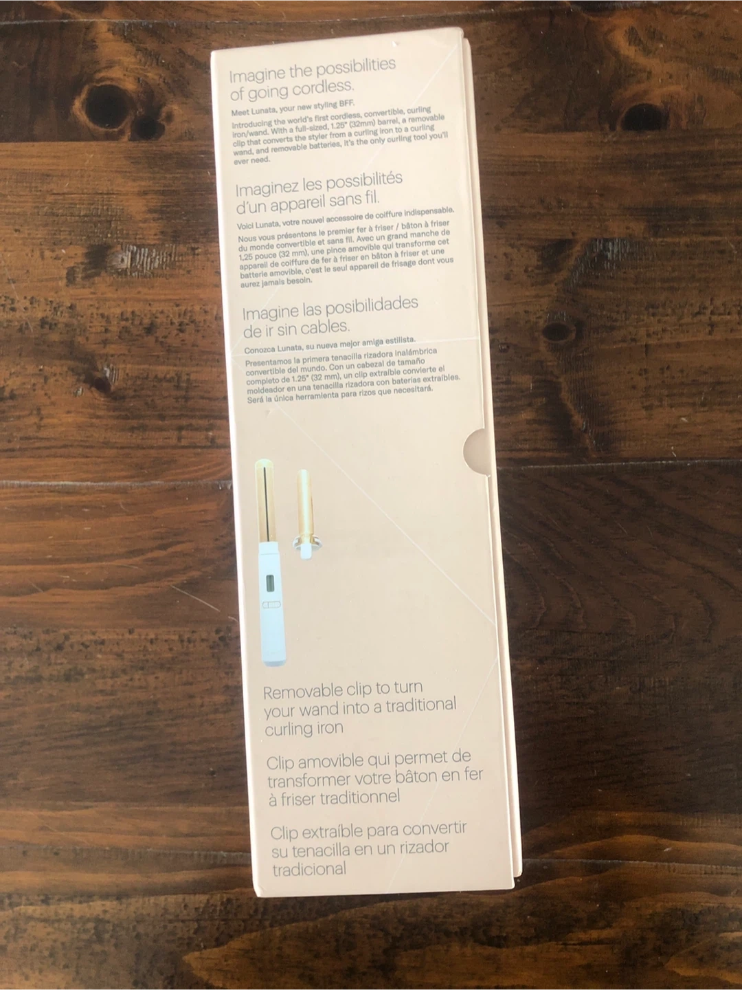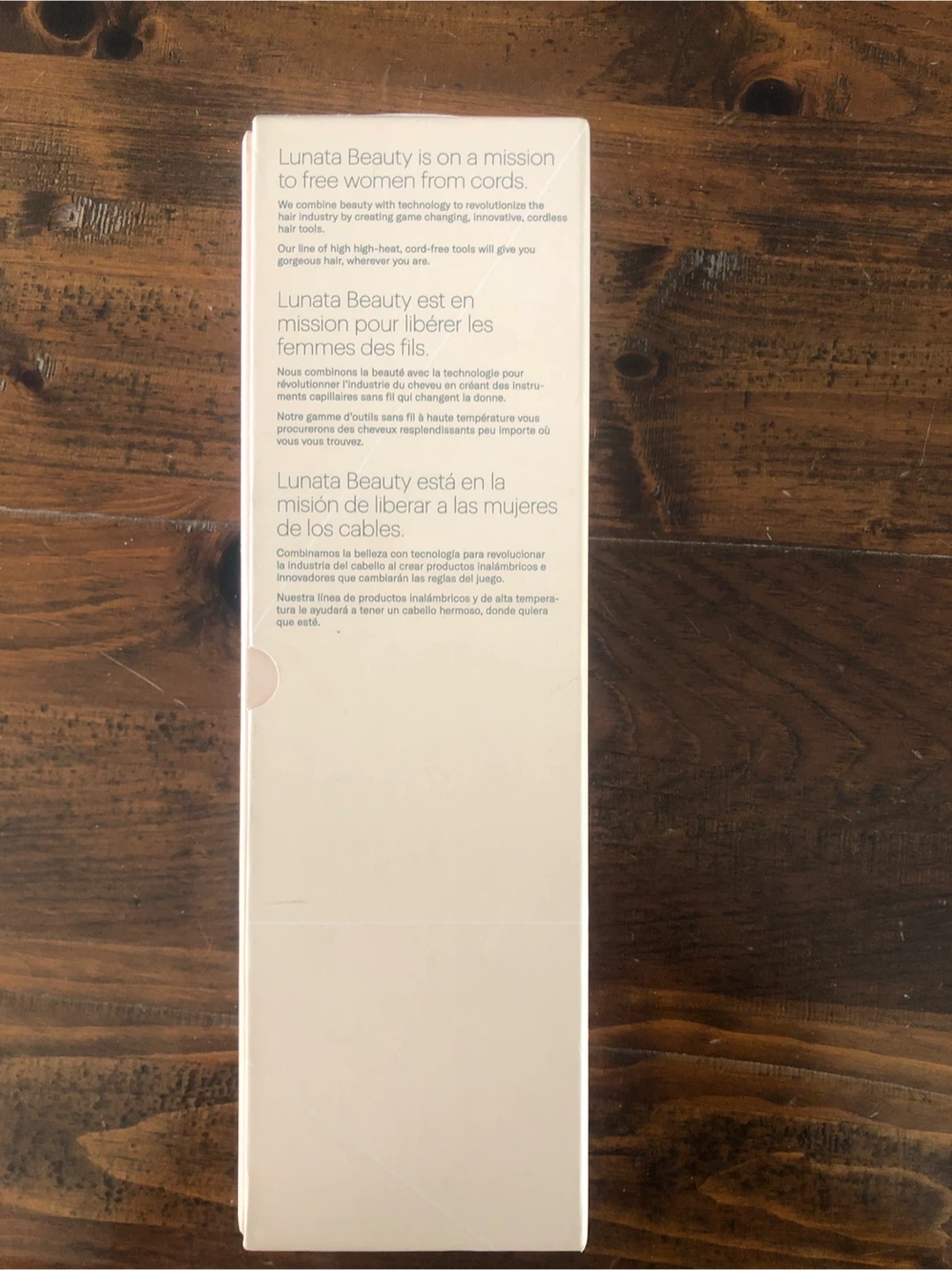 This is the Lunata Beauty cordless curler with a 32mm titanium barrel. It converts to a traditional curling iron and includes a heat-proof sleeve and charging cable. It reaches up to 450 degrees Fahrenheit with multiple heat modes. The box is a little worn but the curler has never been used.