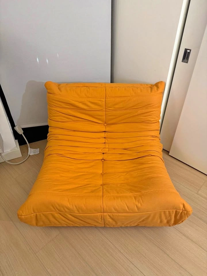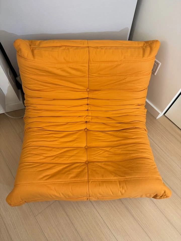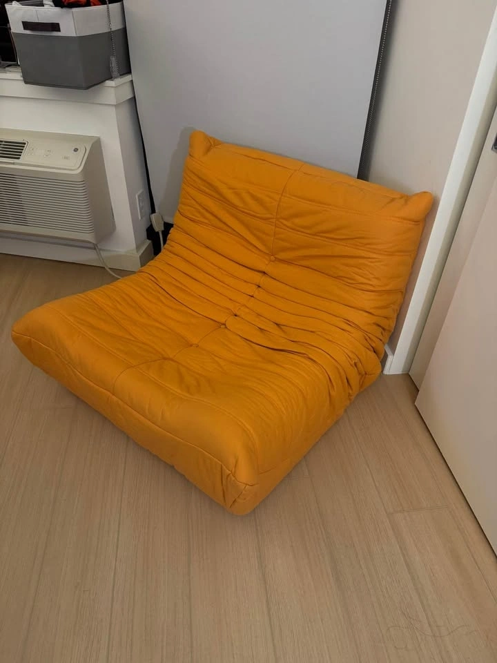 Selling this vibrant Saffron Orange Togo-style fireside chair. It’s an iconic, low-profile design that is incredibly comfortable for lounging, gaming, or reading. Condition: Excellent / Like New. This has barely been used. Clean, no stains, and from a smoke-free home. Skip the 3-4 week shipping wait from Amazon or Temu. It’s also super easy to move around your space; fits in the back of any car. The deep pleating and bold color make it a perfect statement piece for a living room or bedroom. Pickup only at 626 Newark Ave apt lobby.