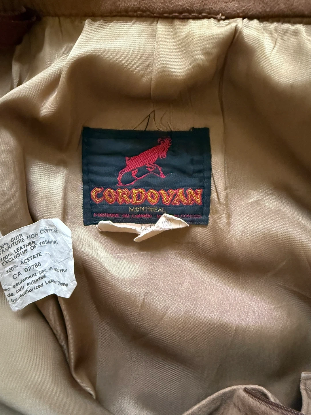 This is a camel colour suede skirt by Cordovan Montreal. It's 100% leather with a 100% acetate lining. This skirt features a back slit for ease of movement.