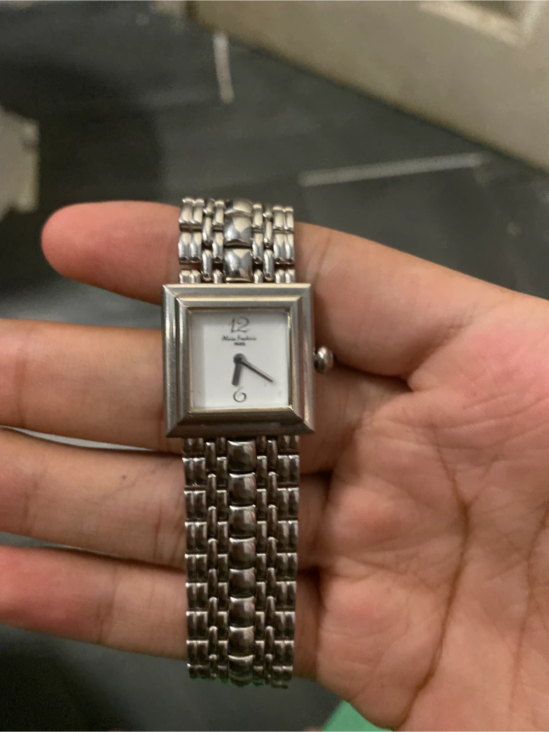 This is an Alain Frederic Paris A530 ladies watch, made in Switzerland. It features a stainless steel band and a square face. This watch is a stylish accessory for any occasion.