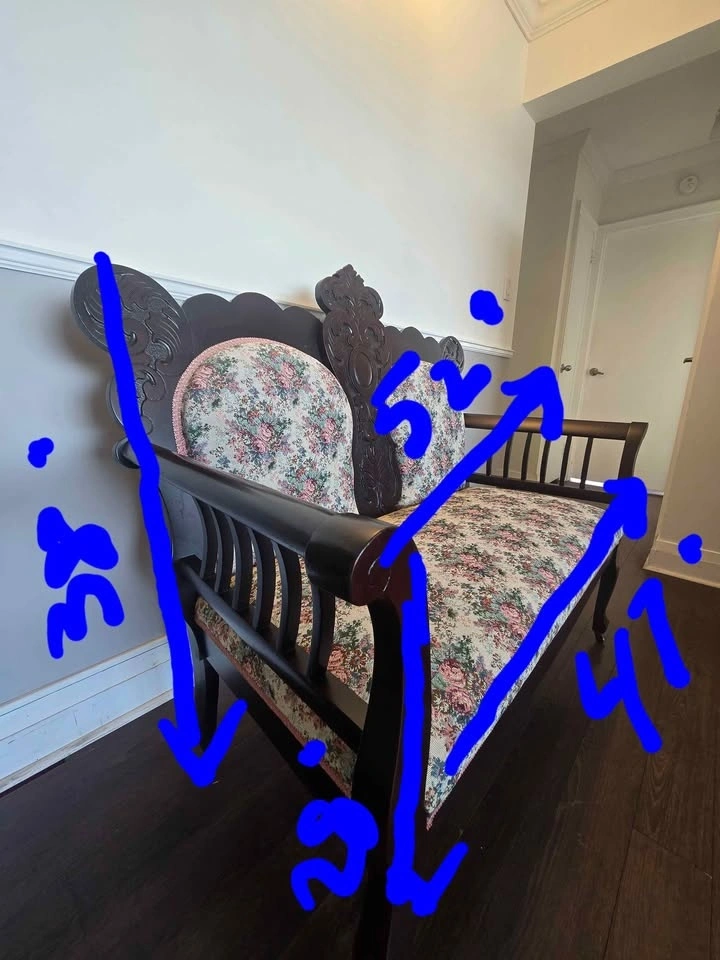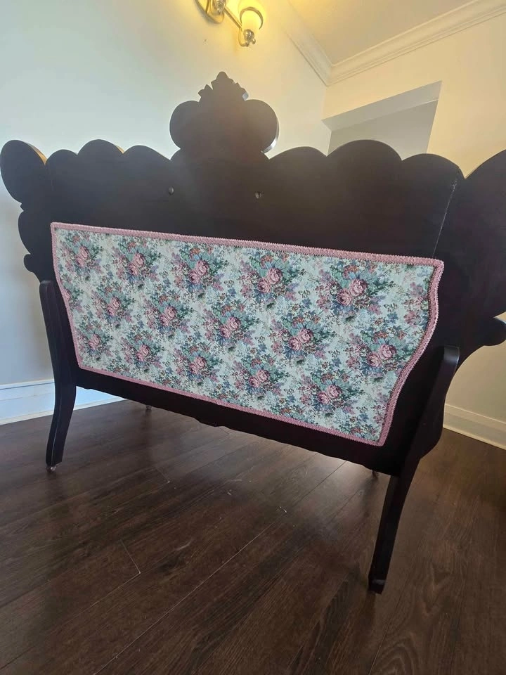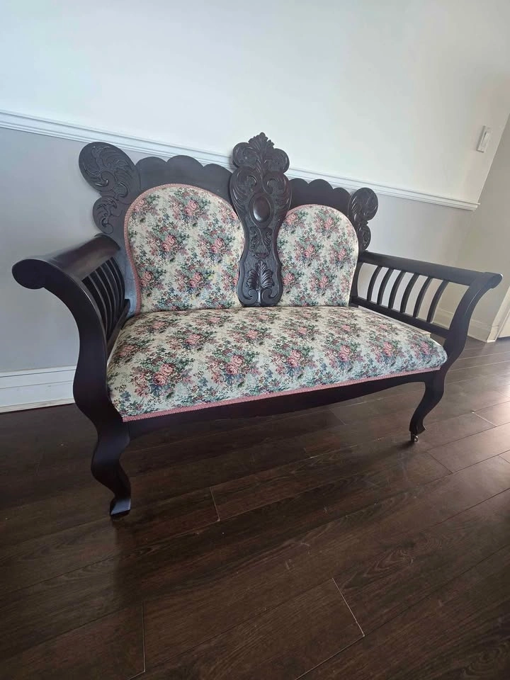 A very beautiful, Vintage, Victorian Style Loveseat/Settee in great condition with carved dark brown wood, floral fabric upholstery and scroll arms. This Loveseat can add a touch of elegance to any room. Pick up from Don Mills and Overlea intersection.