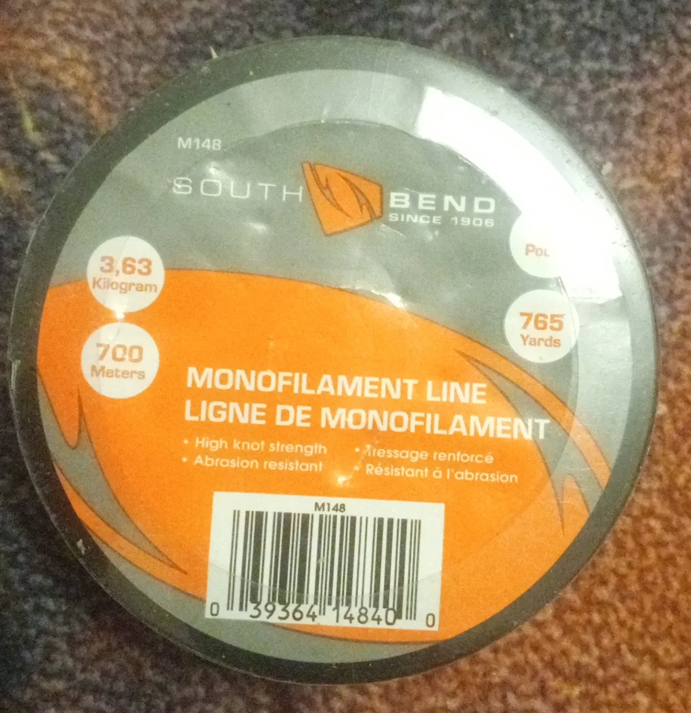 Selling a spool of South Bend monofilament line! It's high knot strength and abrasion resistant, perfect for fishing. The spool contains 765 yards (700 meters) of line and weighs 3.63 kilograms.