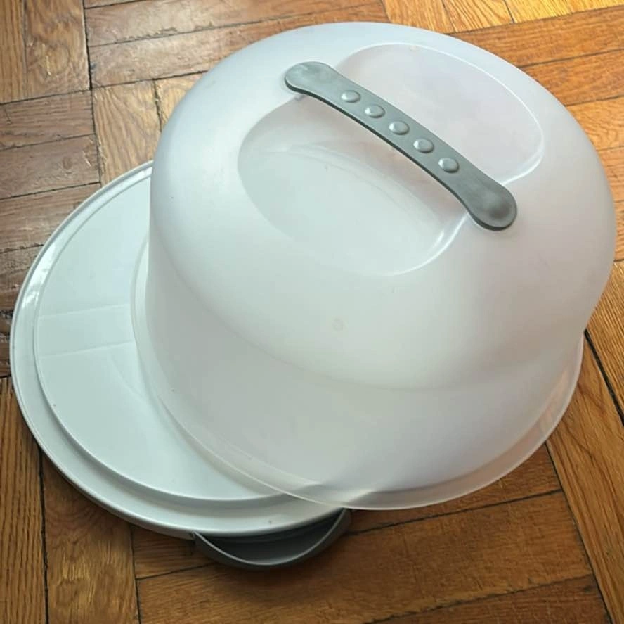 Sterilite plastic cake carrier with latching lid and handle. Designed to carry cakes up to 12 inches and protect them as you travel or to keep fresh on your kitchen counter. Freezer and dishwasher safe. Like new condition. Sells for $20 on Amazon. Pick up on the upper west side of Manhattan.