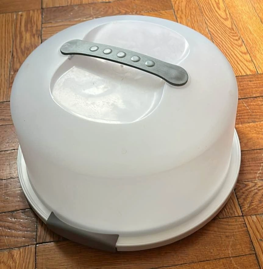 Sterilite plastic cake carrier with latching lid and handle. Designed to carry cakes up to 12 inches and protect them as you travel or to keep fresh on your kitchen counter. Freezer and dishwasher safe. Like new condition. Sells for $20 on Amazon. Pick up on the upper west side of Manhattan.