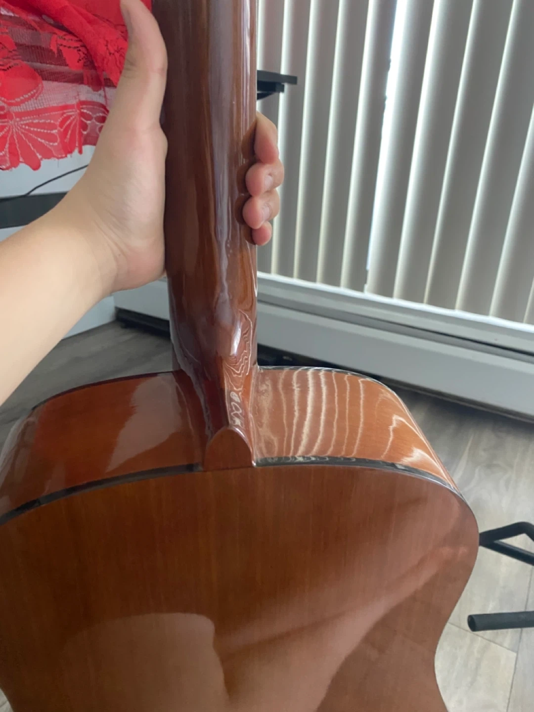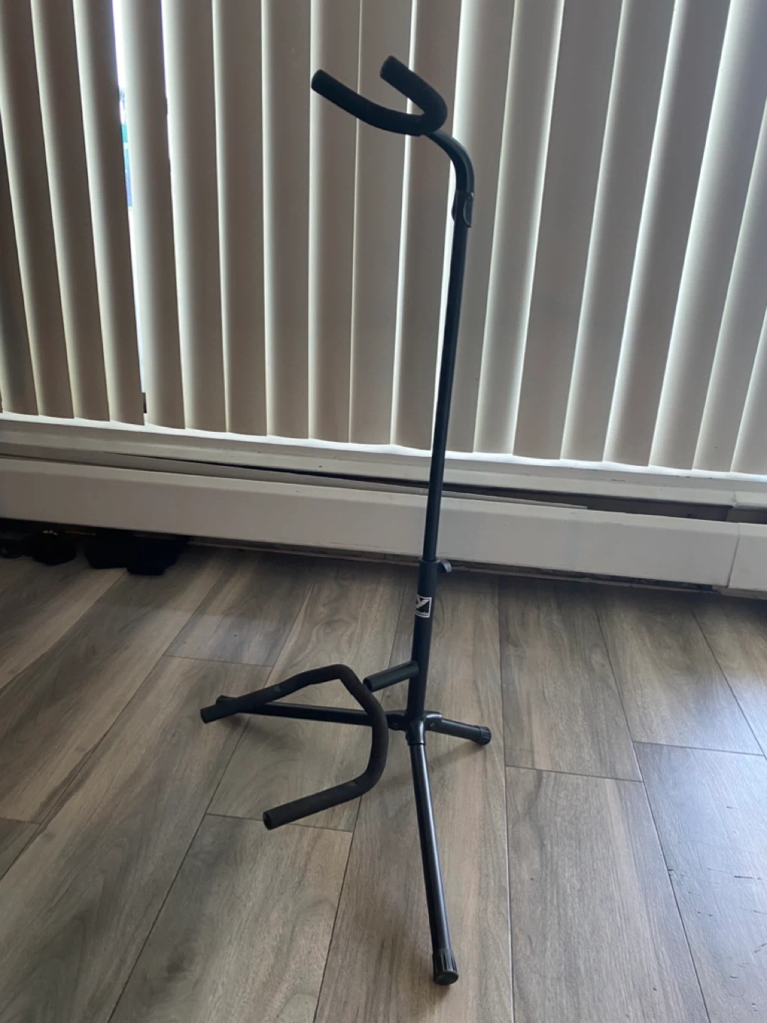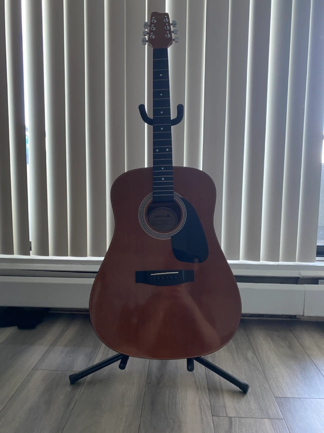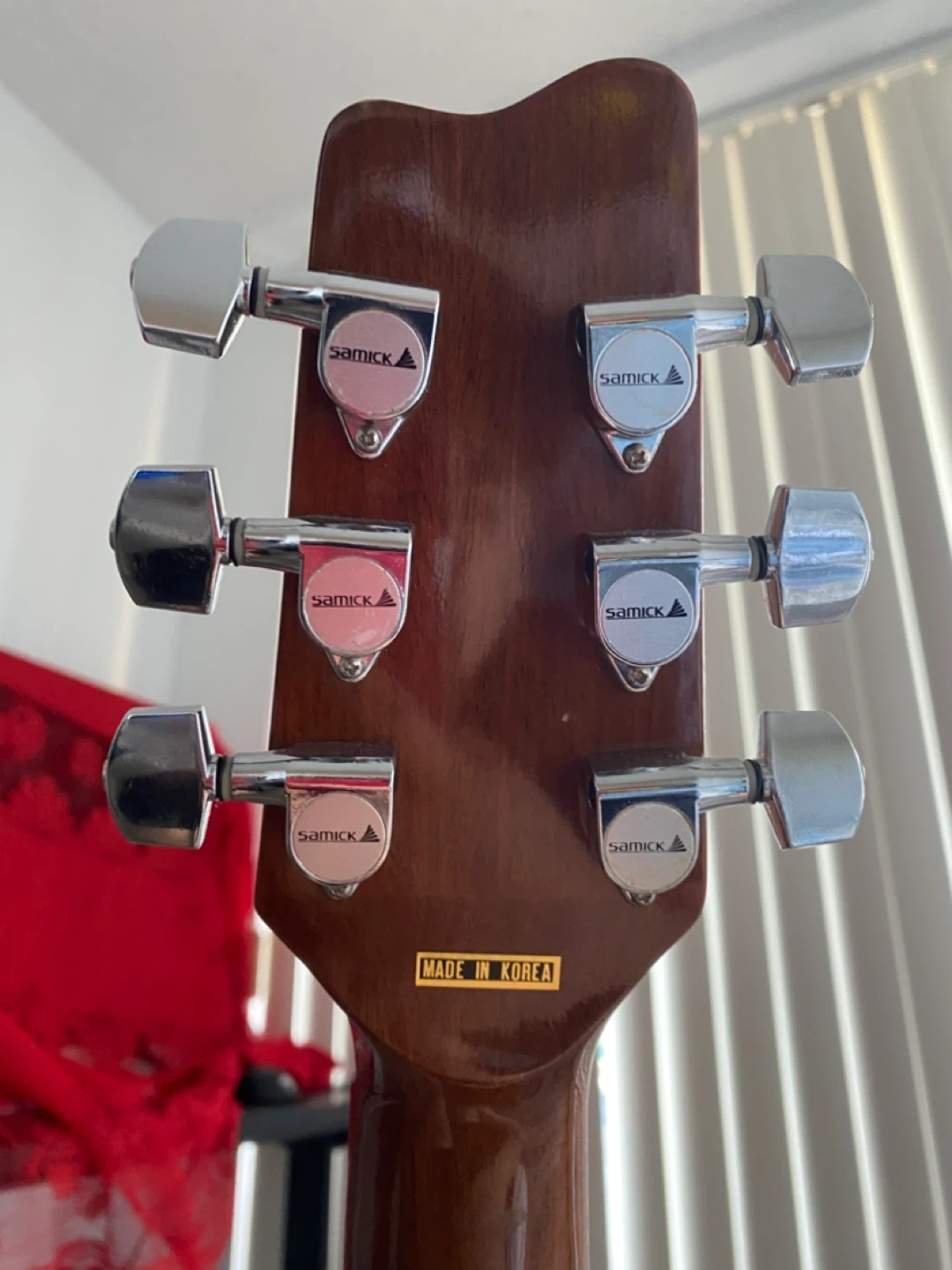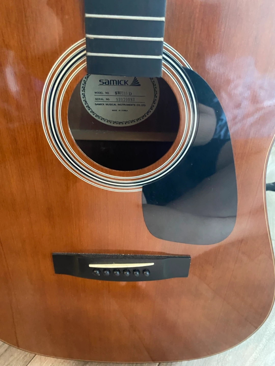 Acoustic guitar from Samick. Made in Korea. This guitar has a polished wood finish. No strings comes with bag and stand.