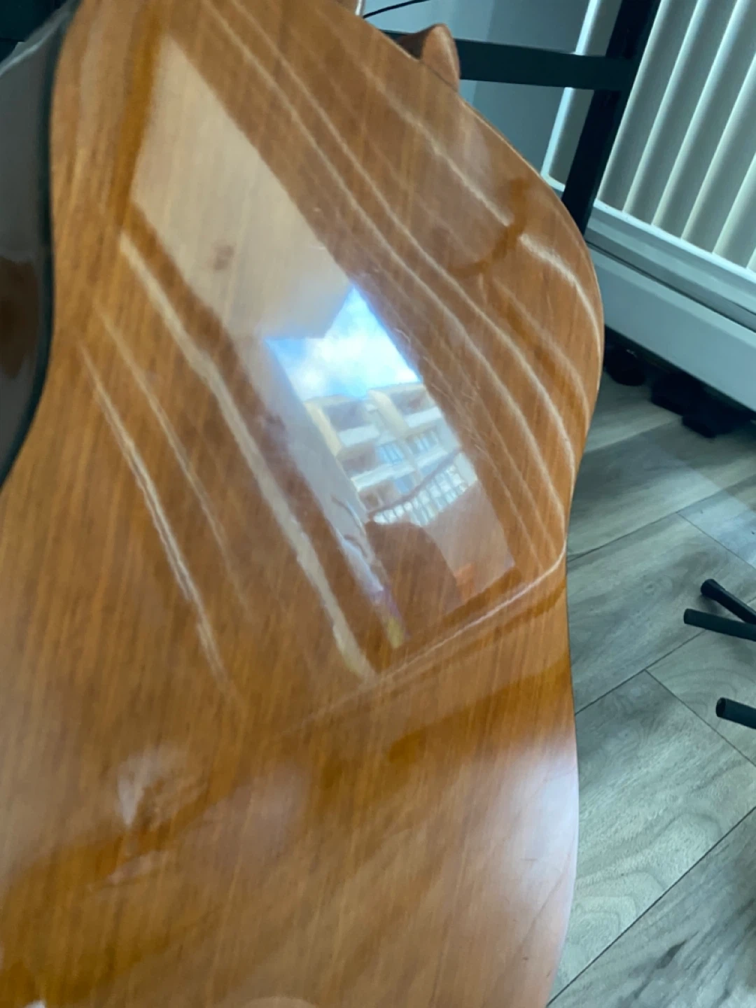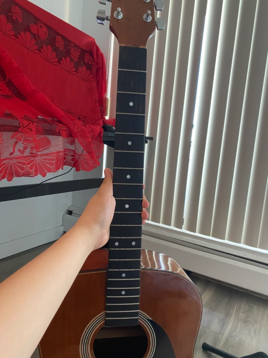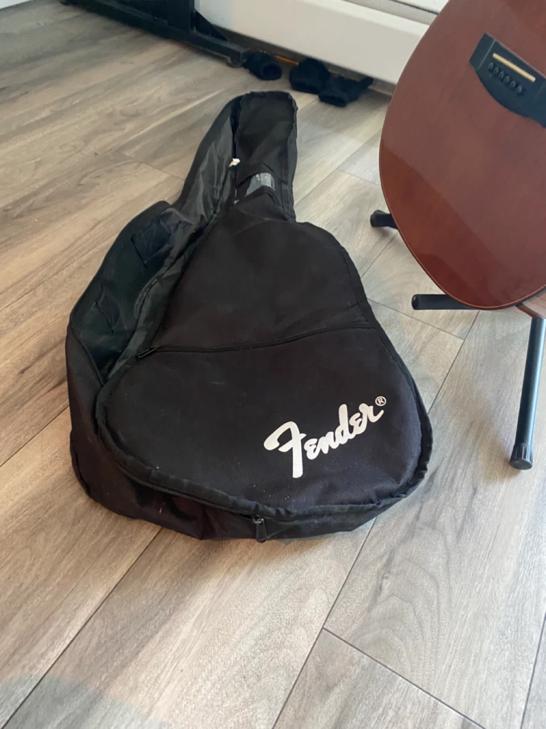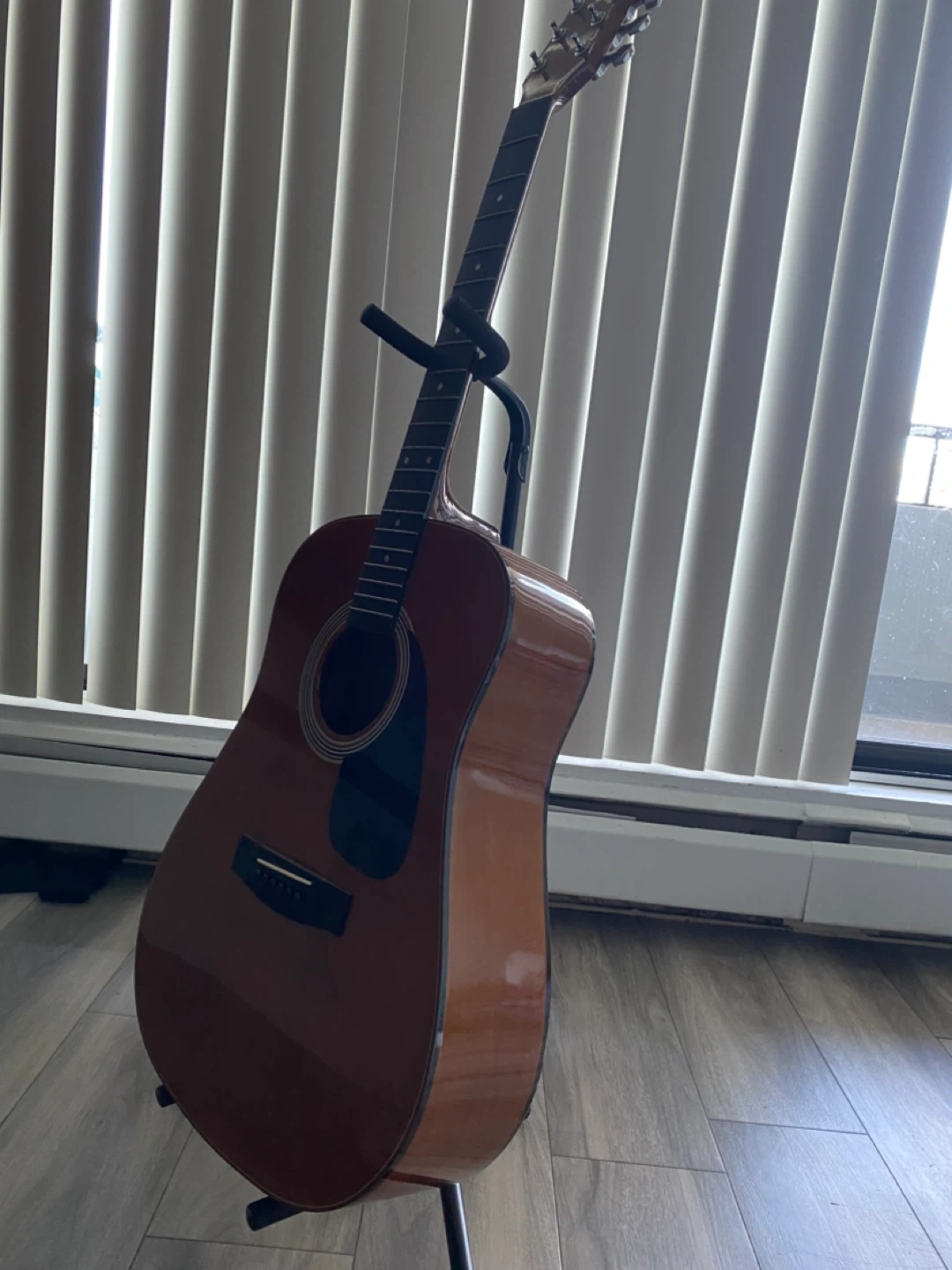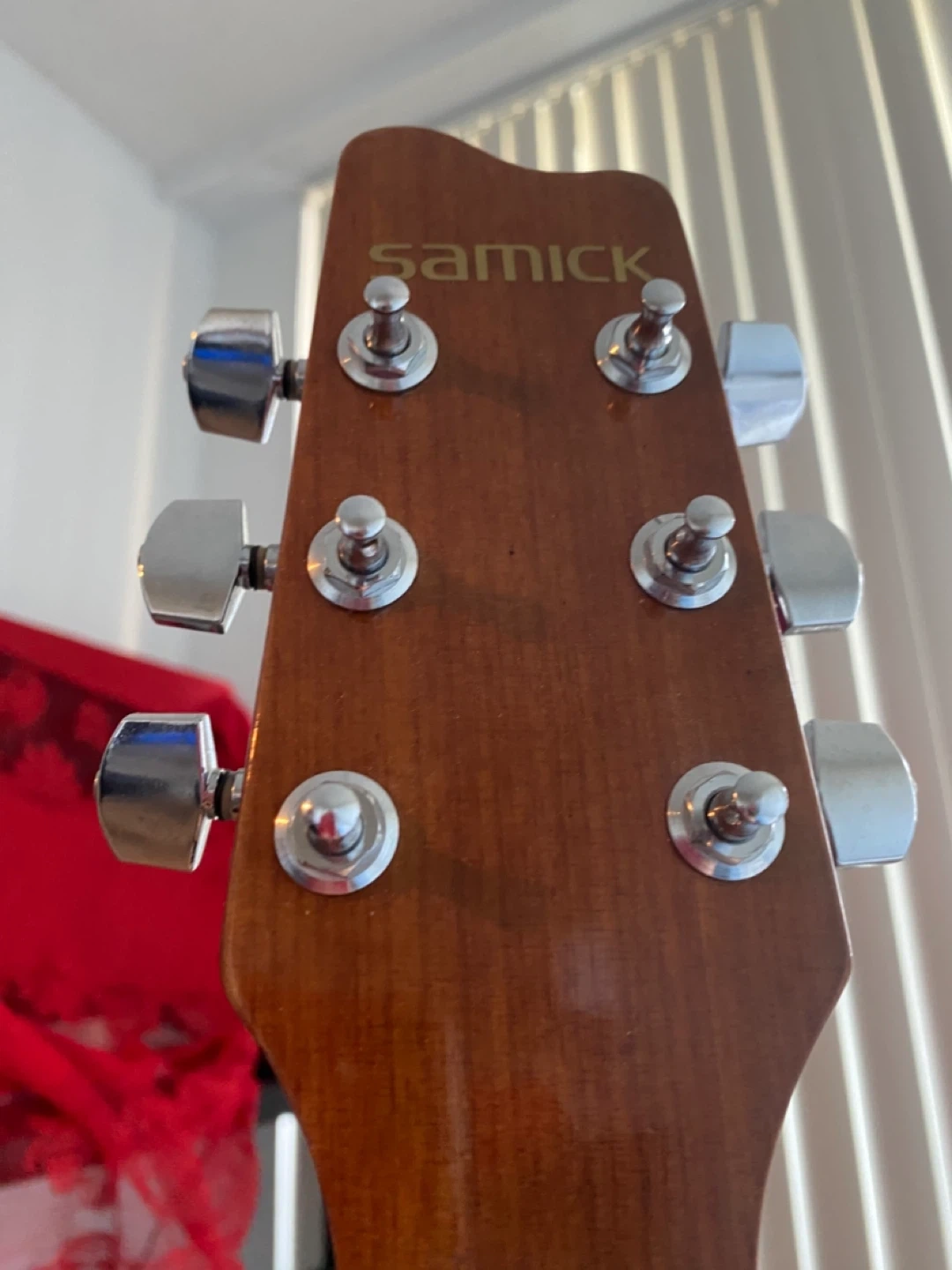Acoustic guitar from Samick. Made in Korea. This guitar has a polished wood finish. No strings comes with bag and stand.