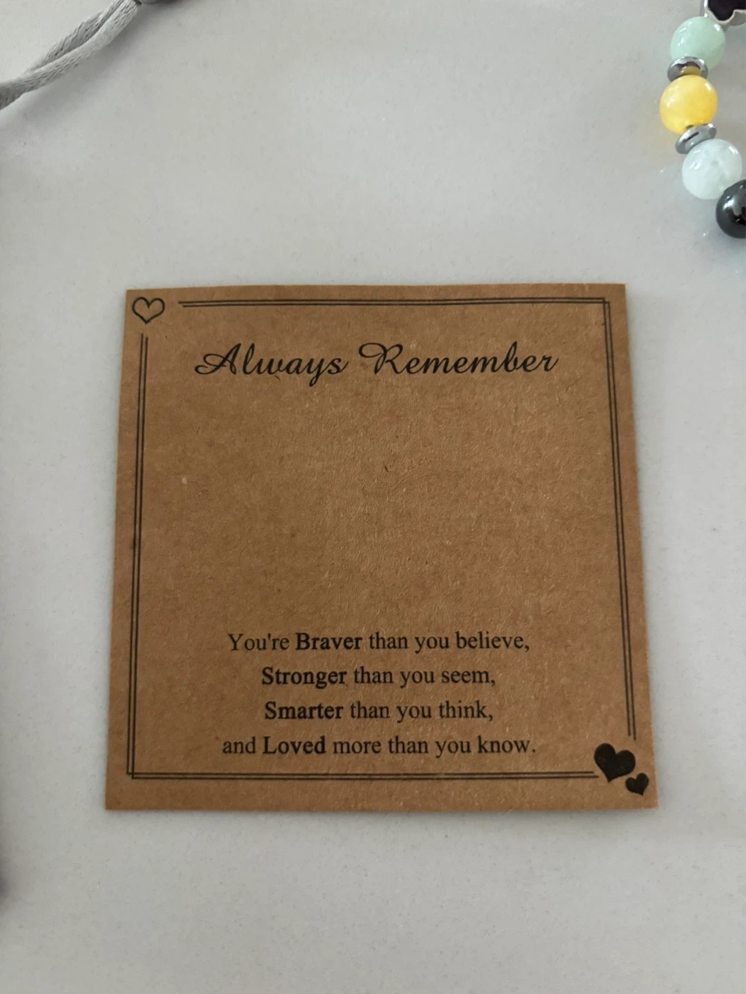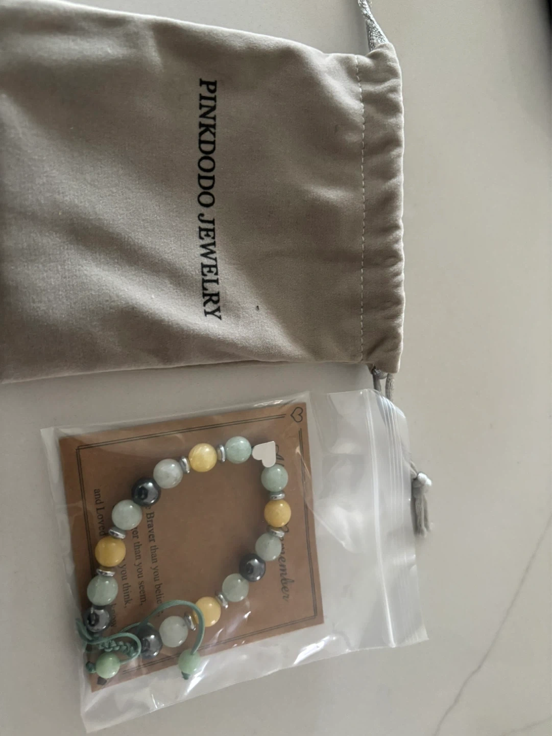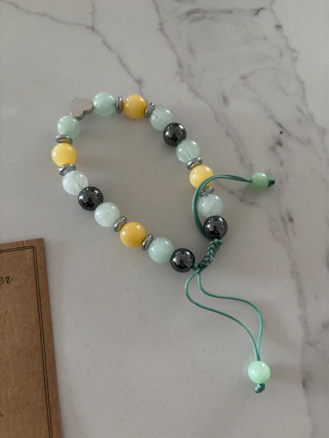Beaded bracelet from Pinkdodo Jewelry with yellow, green, and grey beads. It's strung on a green cord with a sliding knot closure and a small heart charm. Comes with a velvet pouch and a card with an uplifting message.