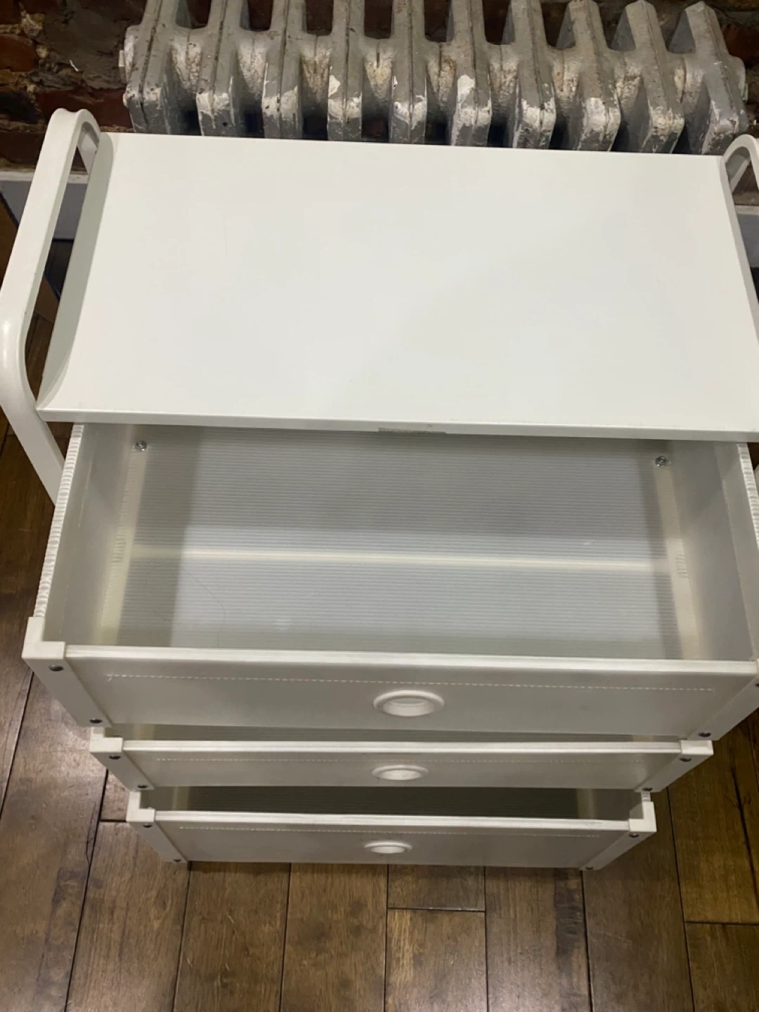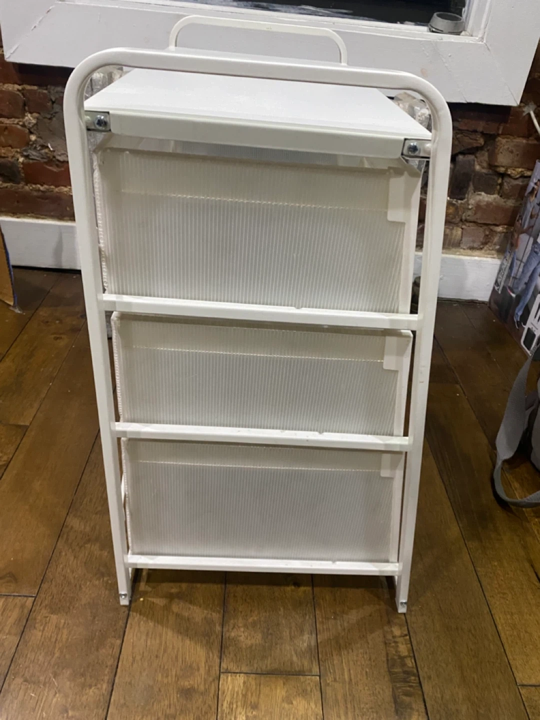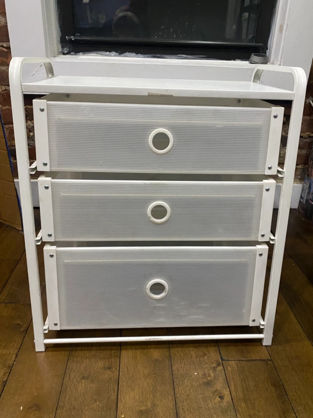 This white storage stand comes with three drawers with a frame that’s made of metal. Originally from IKEA. The drawers are a translucent plastic material. Well loved, but still sturdy and spacious!