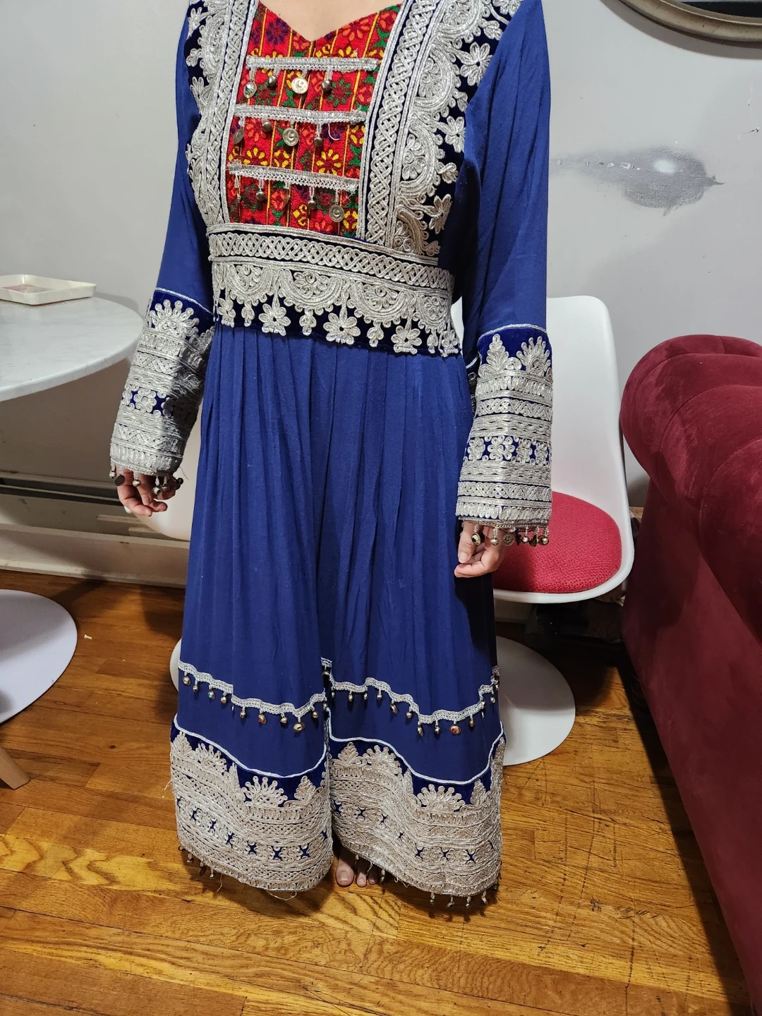 This is a beautiful blue dress featuring intricate embroidery on the bodice and sleeves. It has long sleeves with bell-shaped cuffs adorned with decorative silver trim and small bells. The skirt also has a wide embroidered hemline with dangling bells. The neckline is embellished with colorful embroidered panels and silver coins.