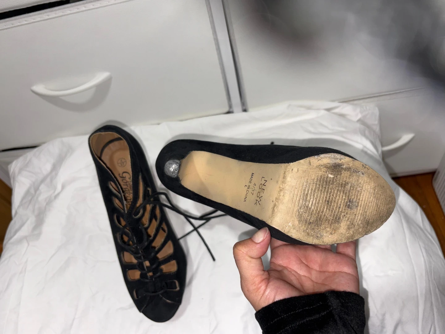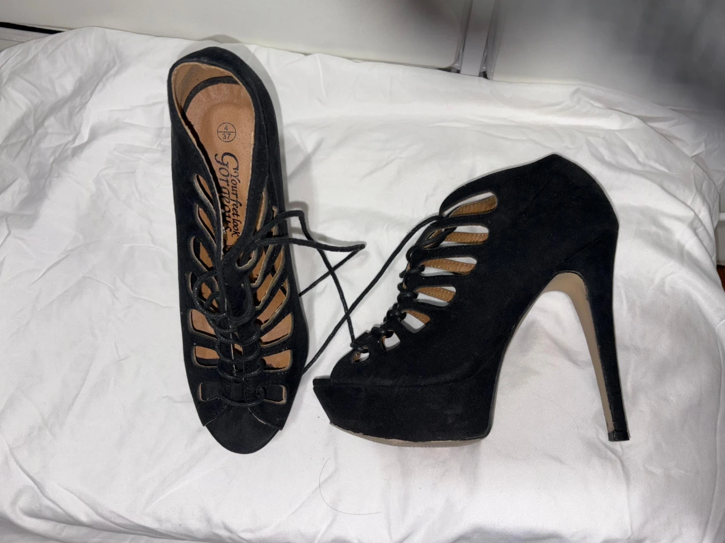 Gorgeous black suede lace-up platform heels. These shoes feature an open toe and intricate cut-out details. Heel height is approximately 5 inches.