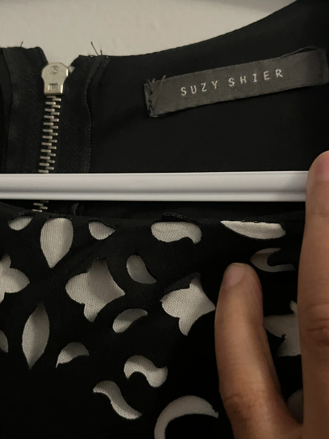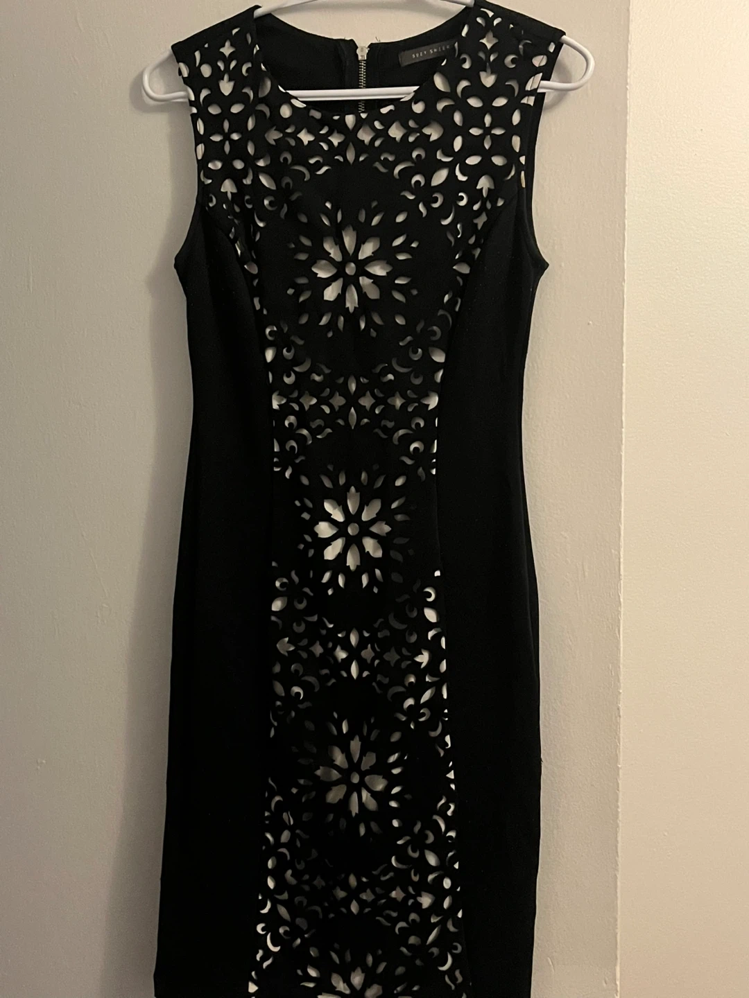 Selling a cute black dress from Suzy Shier! It's a size XS and made of 96% polyester and 4% spandex. Perfect for a night out or a special occasion! The dress features a unique floral cutout design on the front and a zipper in the back