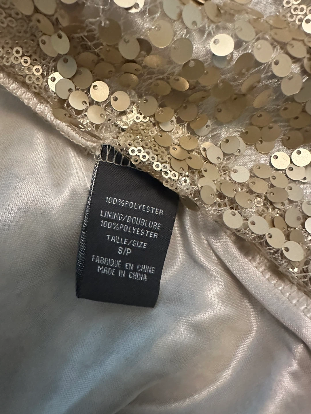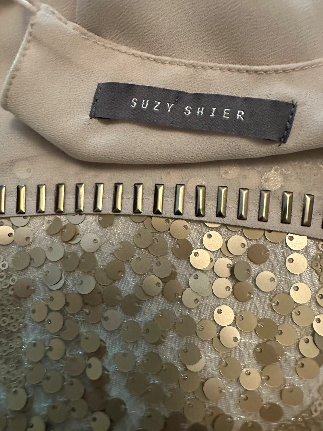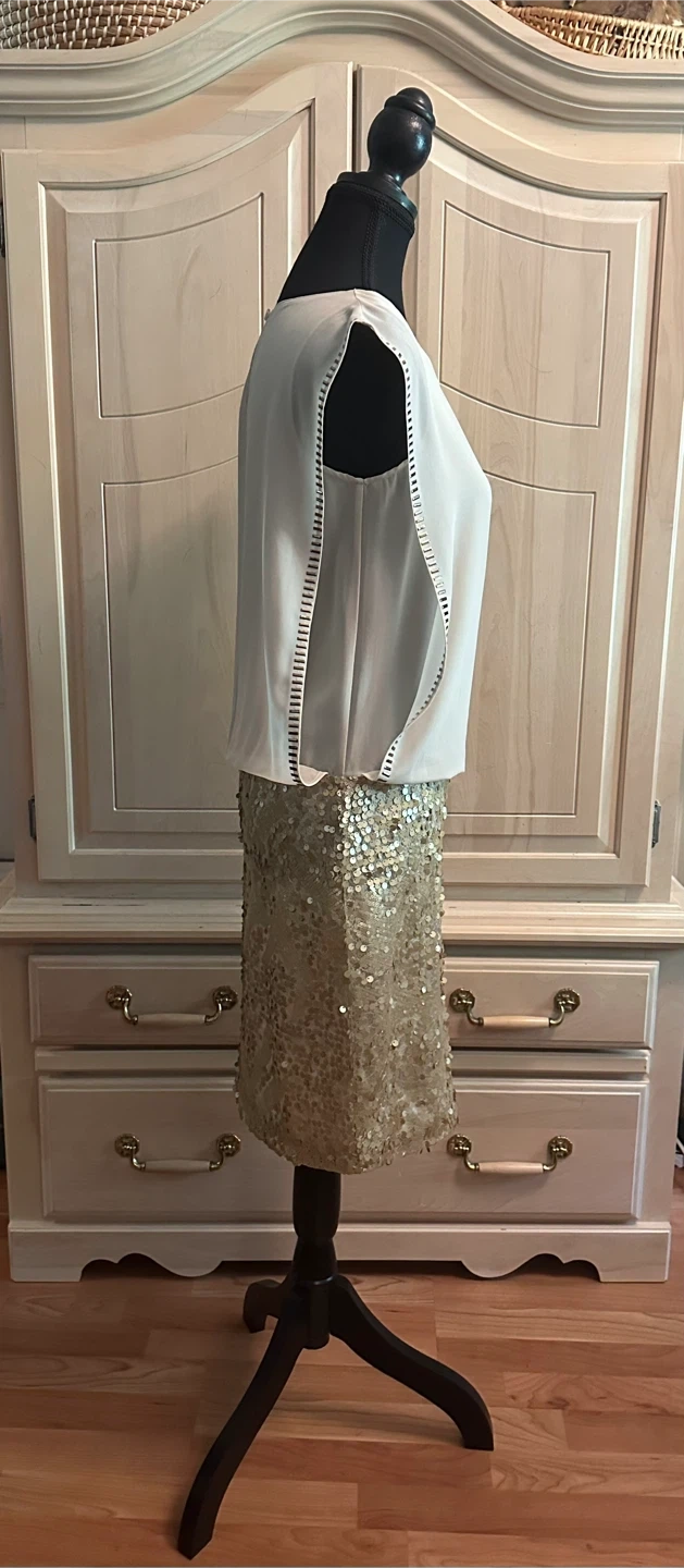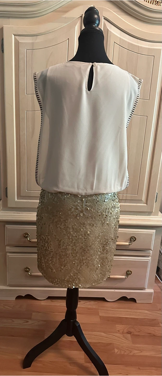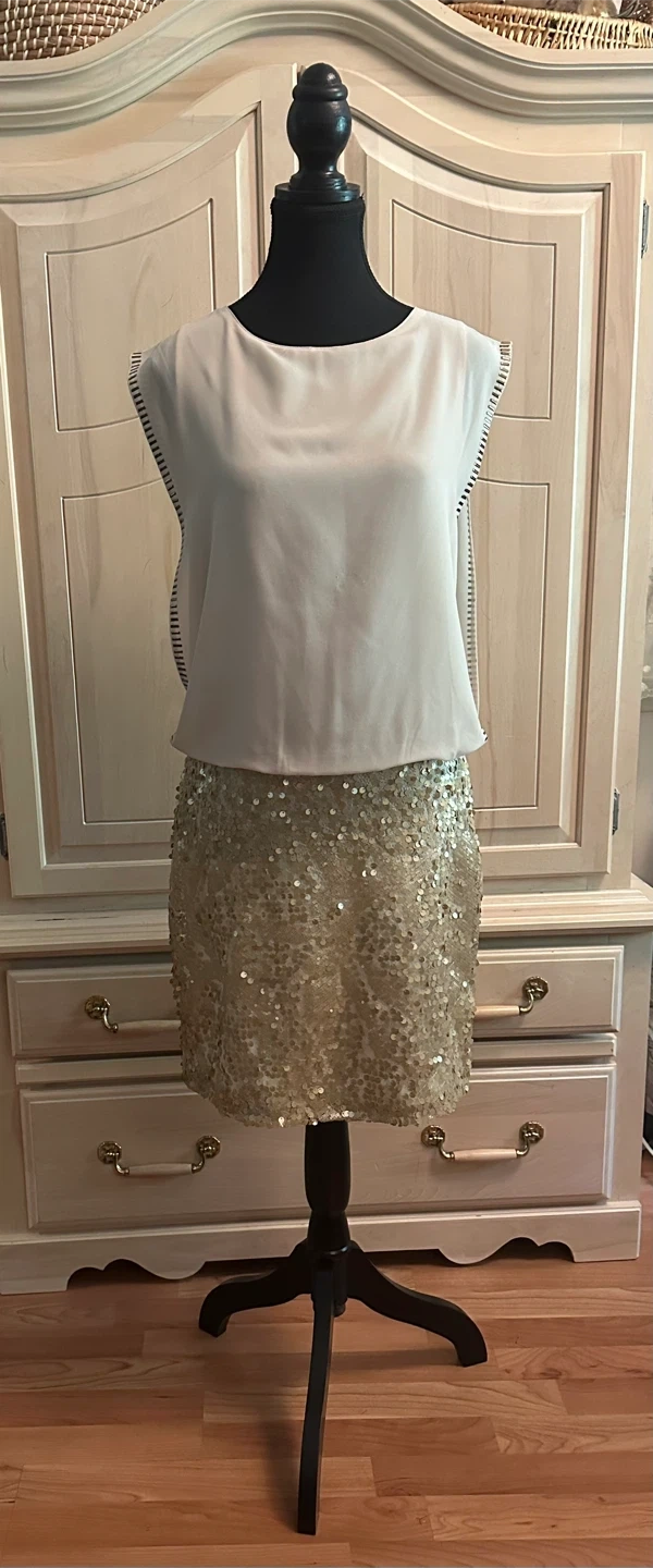 This is a beautiful Suzy Shier dress . It features a cream-coloured top and a gold sequined skirt.It's in great condition and ready for a new home!