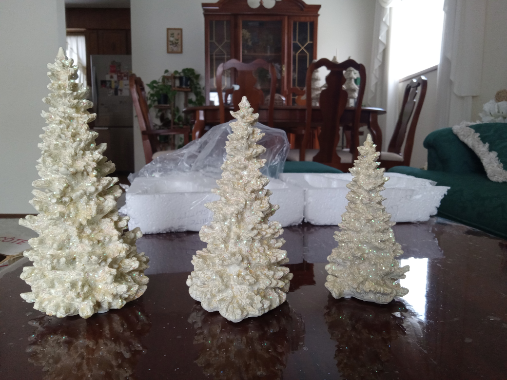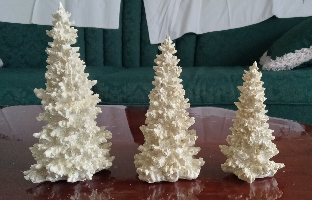 Set of 3 white glitter Christmas trees. The trees are in various sizes. The largest is approximately 12 inches tall and the smallest is approximately 6 inches tall. These trees are perfect for decorating your home for the holidays.