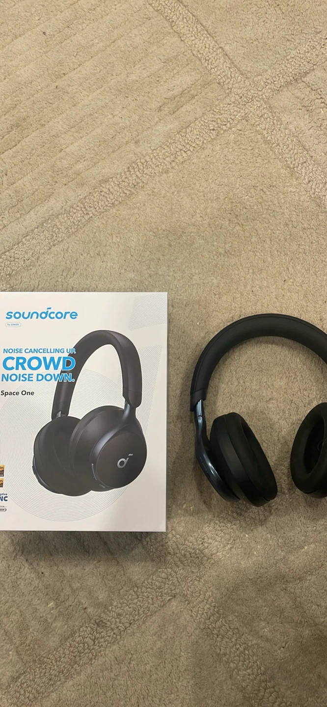 Soundcore Space One headphones with active noise cancellation. These are over-ear headphones. They include the original box and packaging.