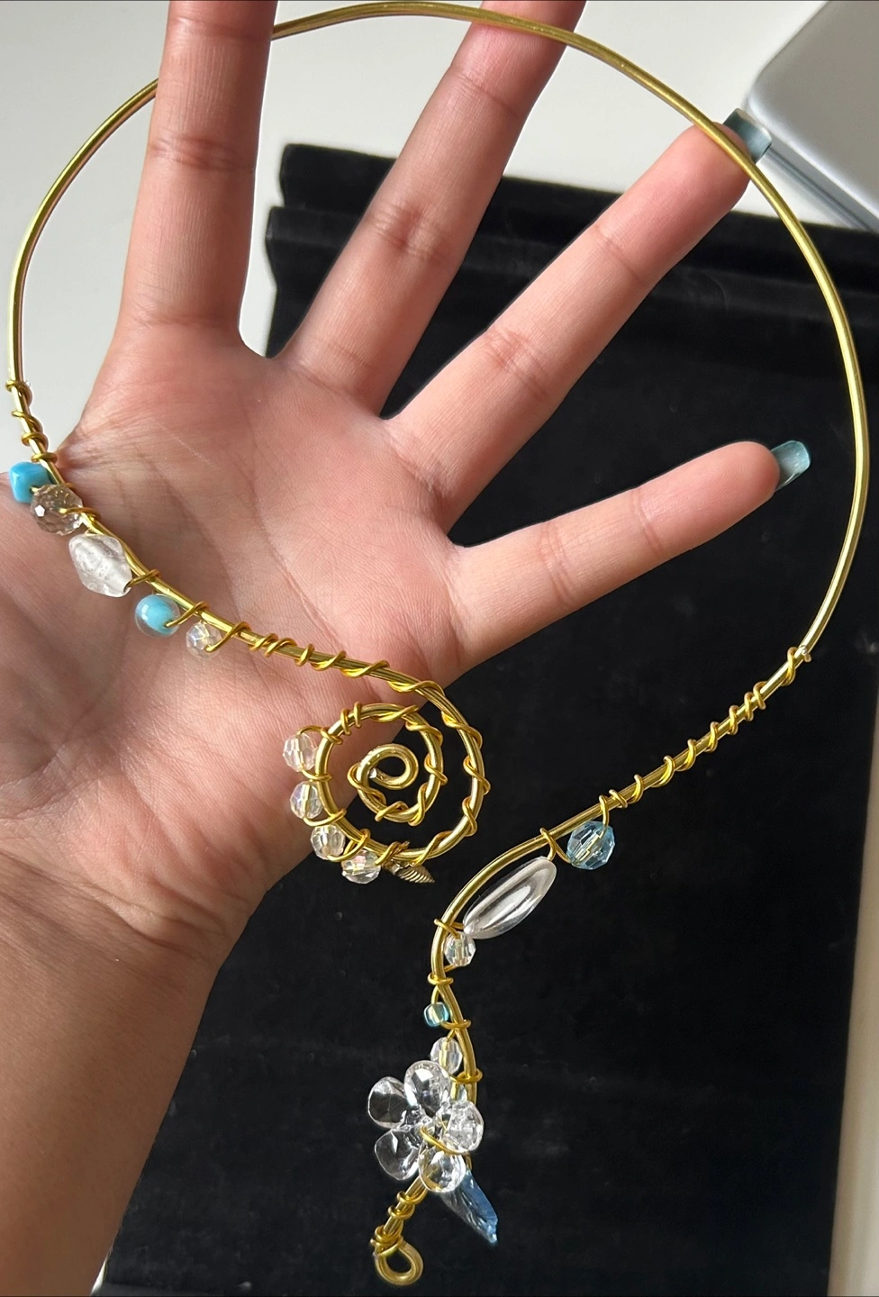 Beautiful gold-tone necklace with unique beadwork! It features a spiral design and clear, white, and blue beads. Perfect for adding a touch of elegance to any outfit