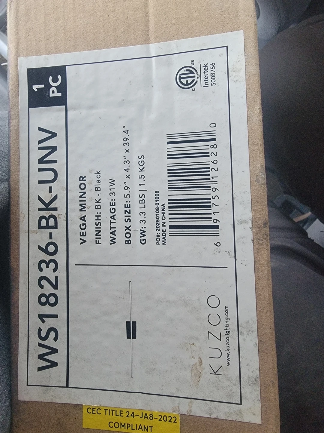 This is a Kuzco WS18236-BK-UNV Vega Minor light fixture. It has a 31W wattage and a black finish. Box size is 5.9" x 4.3" x 39.4".
