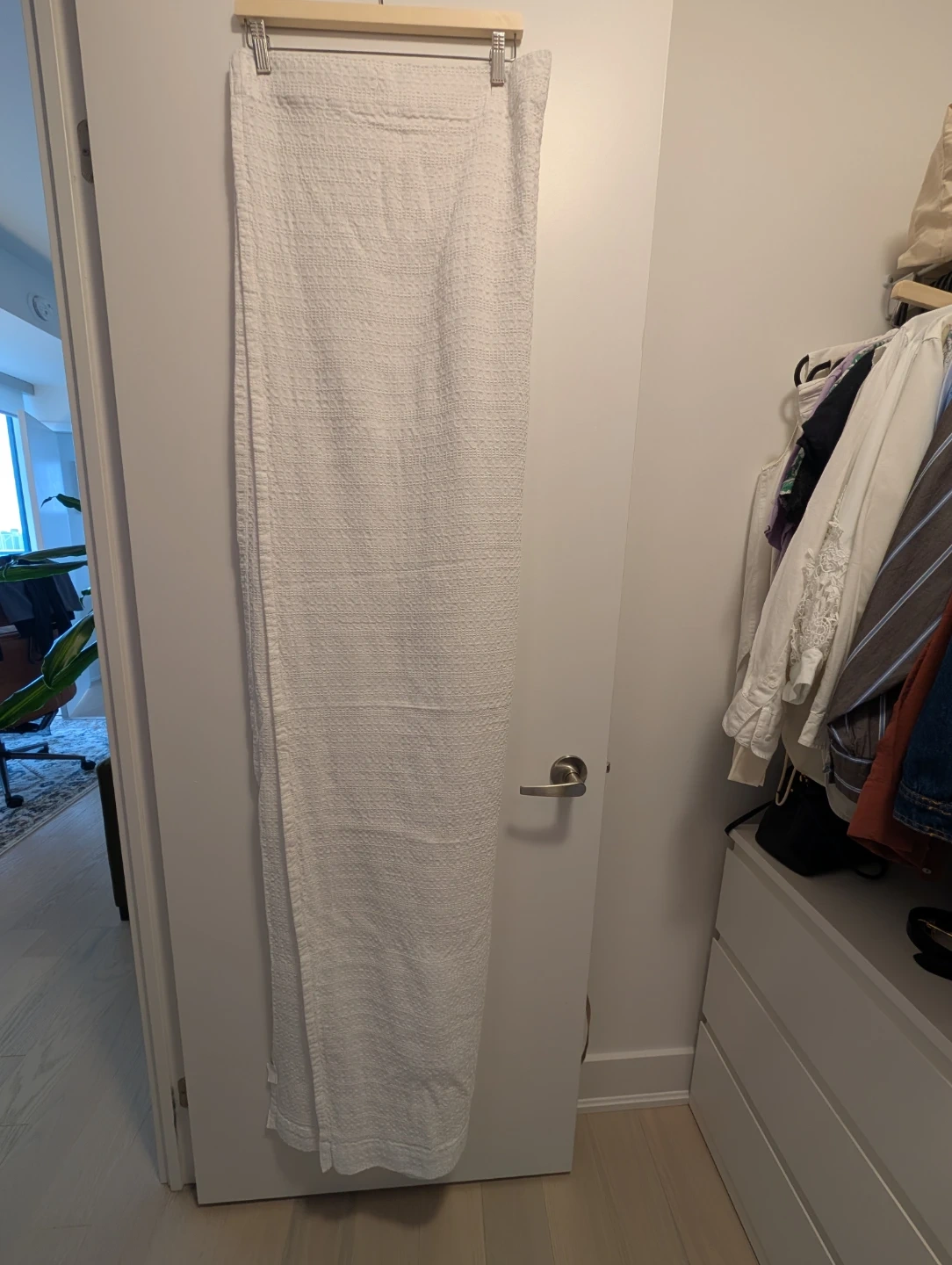 100% cotton shower curtain with a textured pattern. I originally bought it from Home sense for 24+tax. Selling because I recently move to a new apartment where the shower has a glass door therefore no longer need it. It's in perfect condition.
