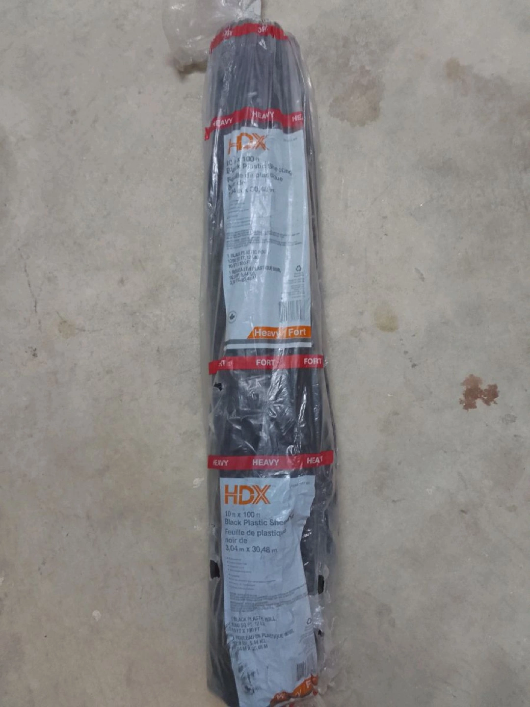 Heavy duty plastic sheeting. 1 roll, 10 ft x 100 ft. Missing a small piece but most of it is still there