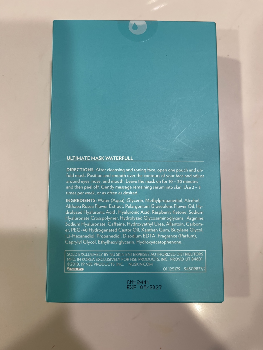 Selling a box of Nu Skin Ultimate Mask Waterfull, which includes 8 masks. These masks are designed to hydrate and tone your face. After cleansing, simply open a pouch, apply the mask, and relax for 10–20 minutes, then peel off. You can use the remaining serum as desired. Expiry date is May 2027