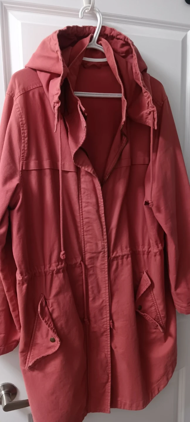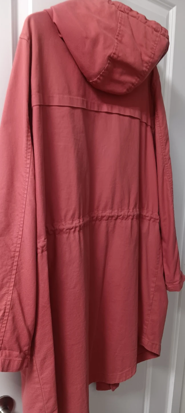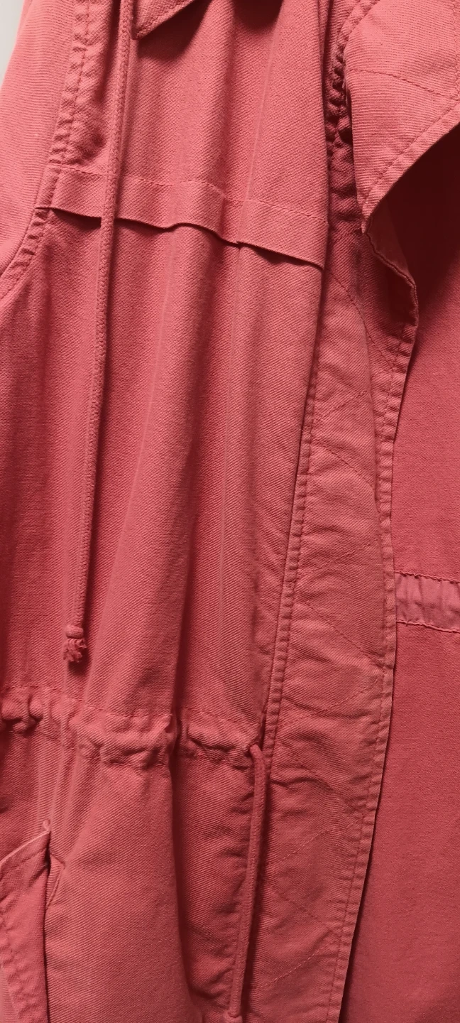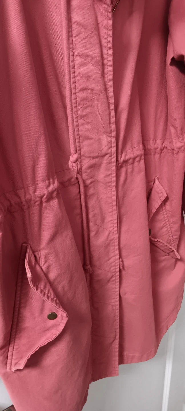 A casual pink utility jacket with a hood. It features a drawstring waist for a customizable fit and multiple pockets. This jacket is perfect for cooler weather!