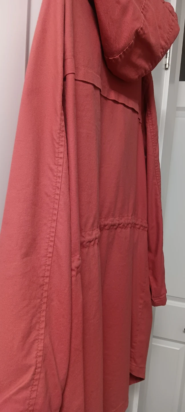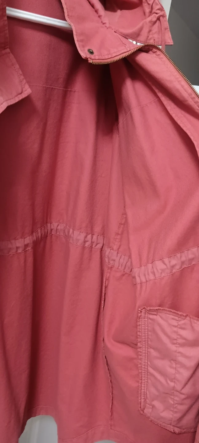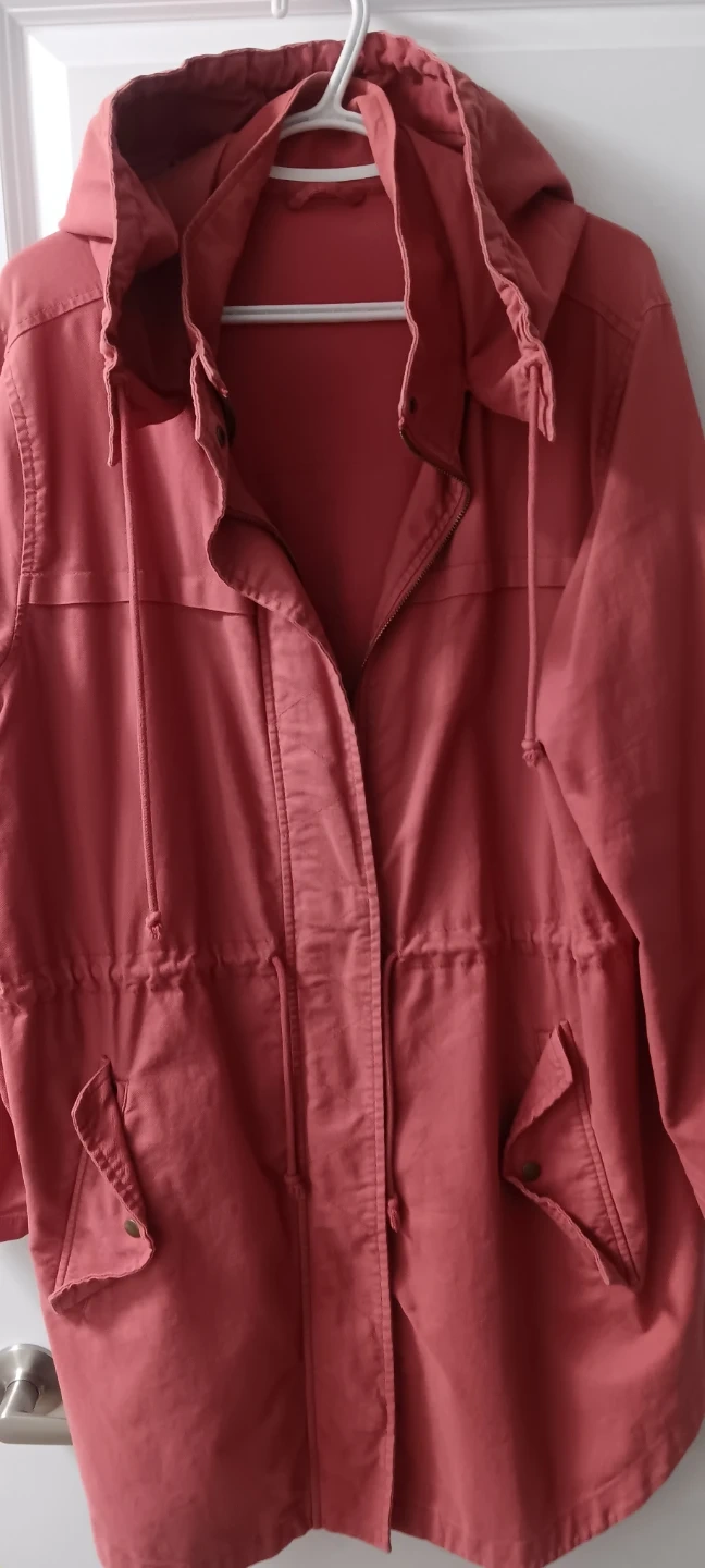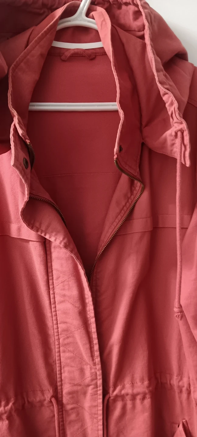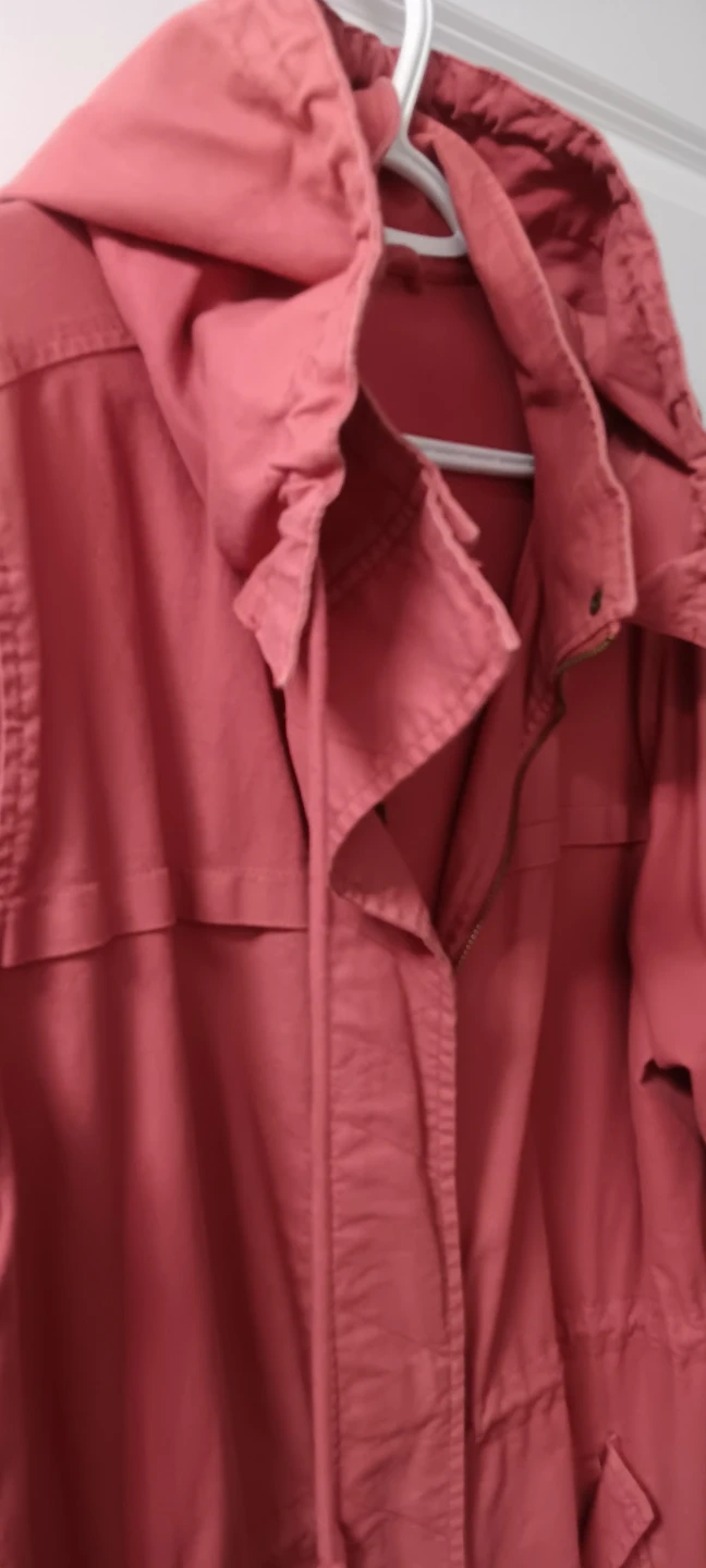 A casual pink utility jacket with a hood. It features a drawstring waist for a customizable fit and multiple pockets. This jacket is perfect for cooler weather!