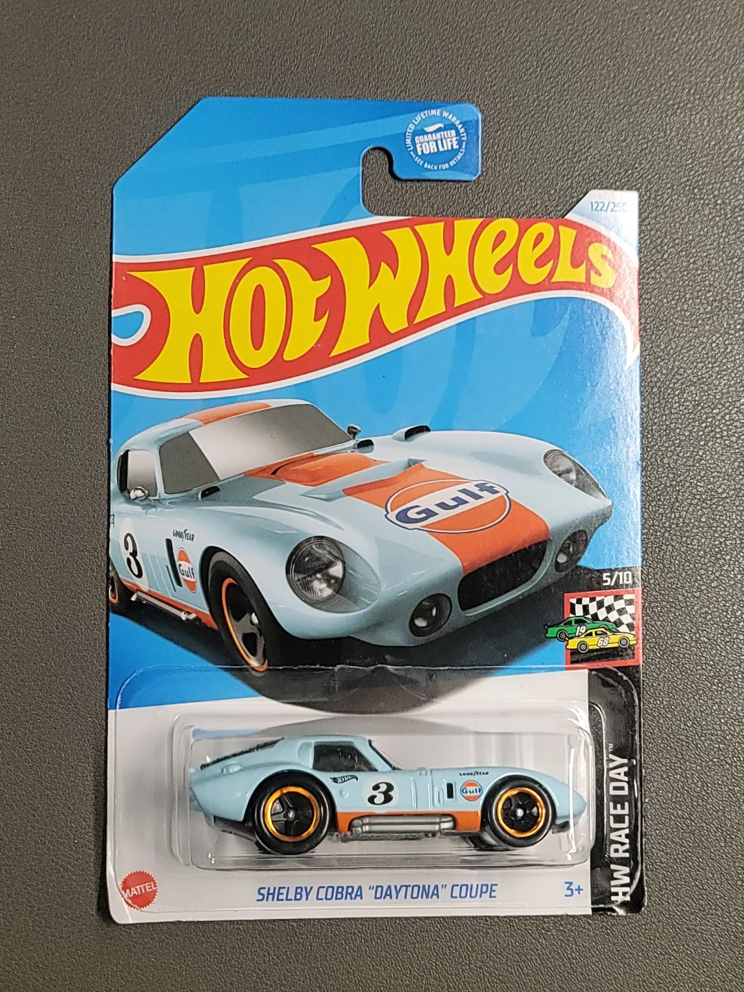 Hot Wheels 1:64 scale Shelby Cobra "Daytona" Coupe. It's a Gulf livery edition with number 3. Recommended for ages 3 and up.