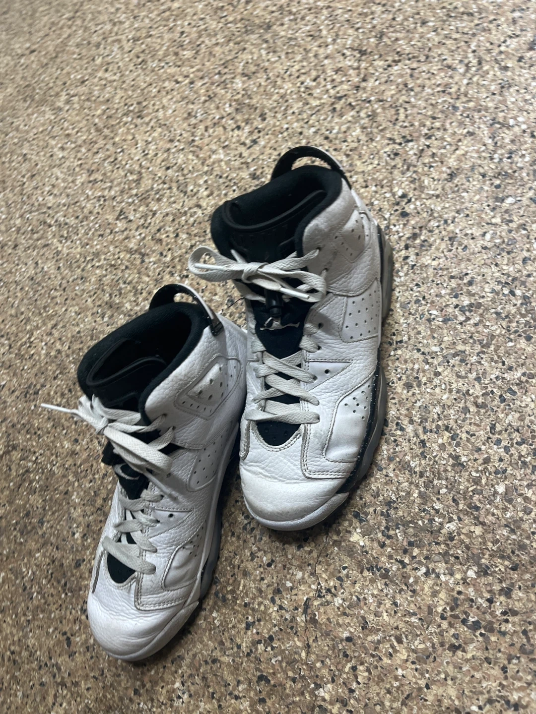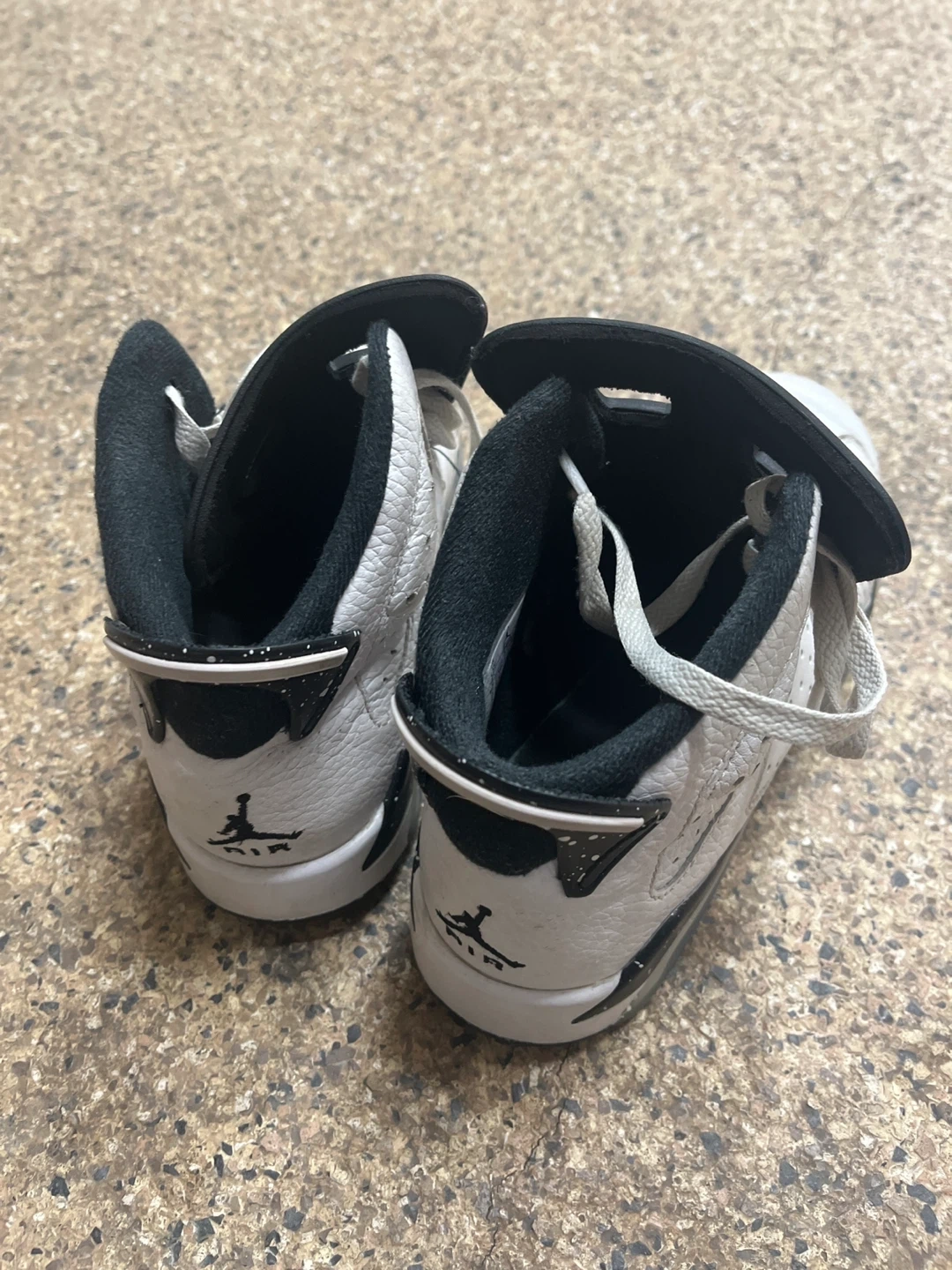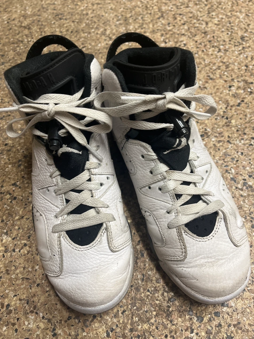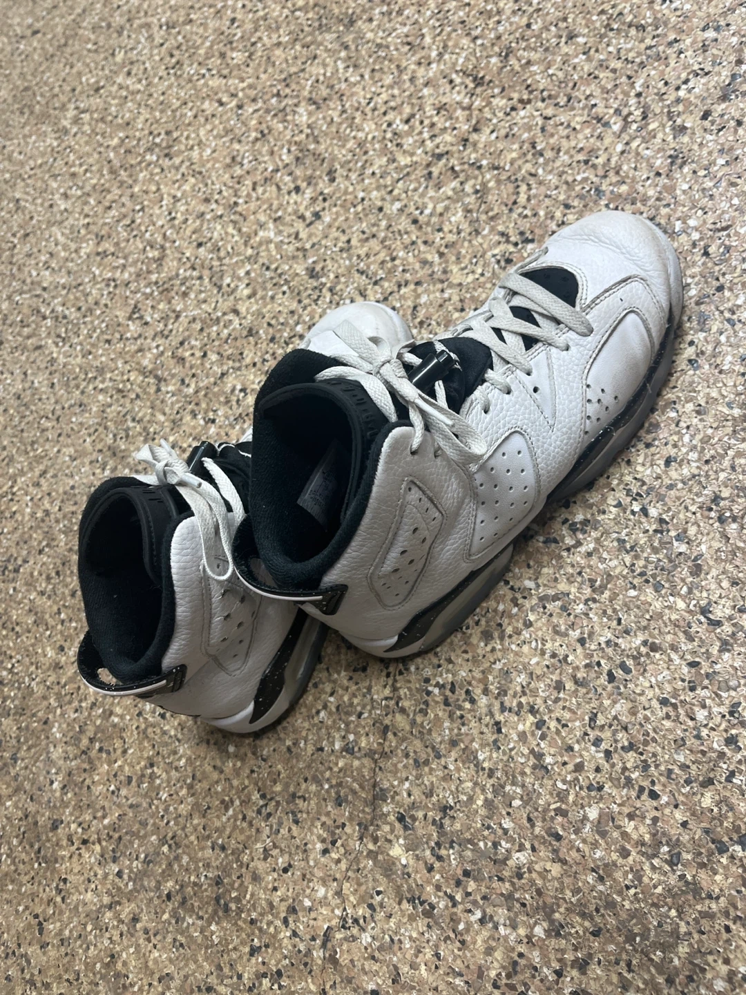 Classic white and black Air Jordan 6 Retro sneakers. Leather upper with perforations. Speckled midsole detail. These kicks are ready for their next adventure!