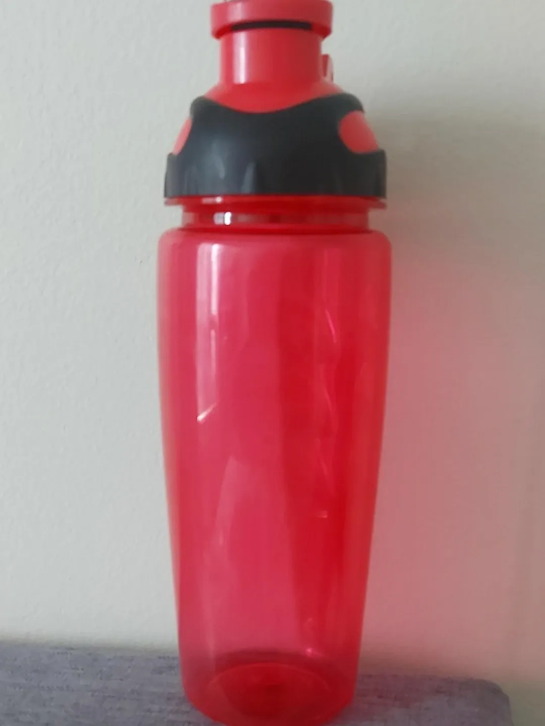 This is a bright red sports water bottle. It's made of plastic and has a black and red lid. It's great for the gym or on the go!
