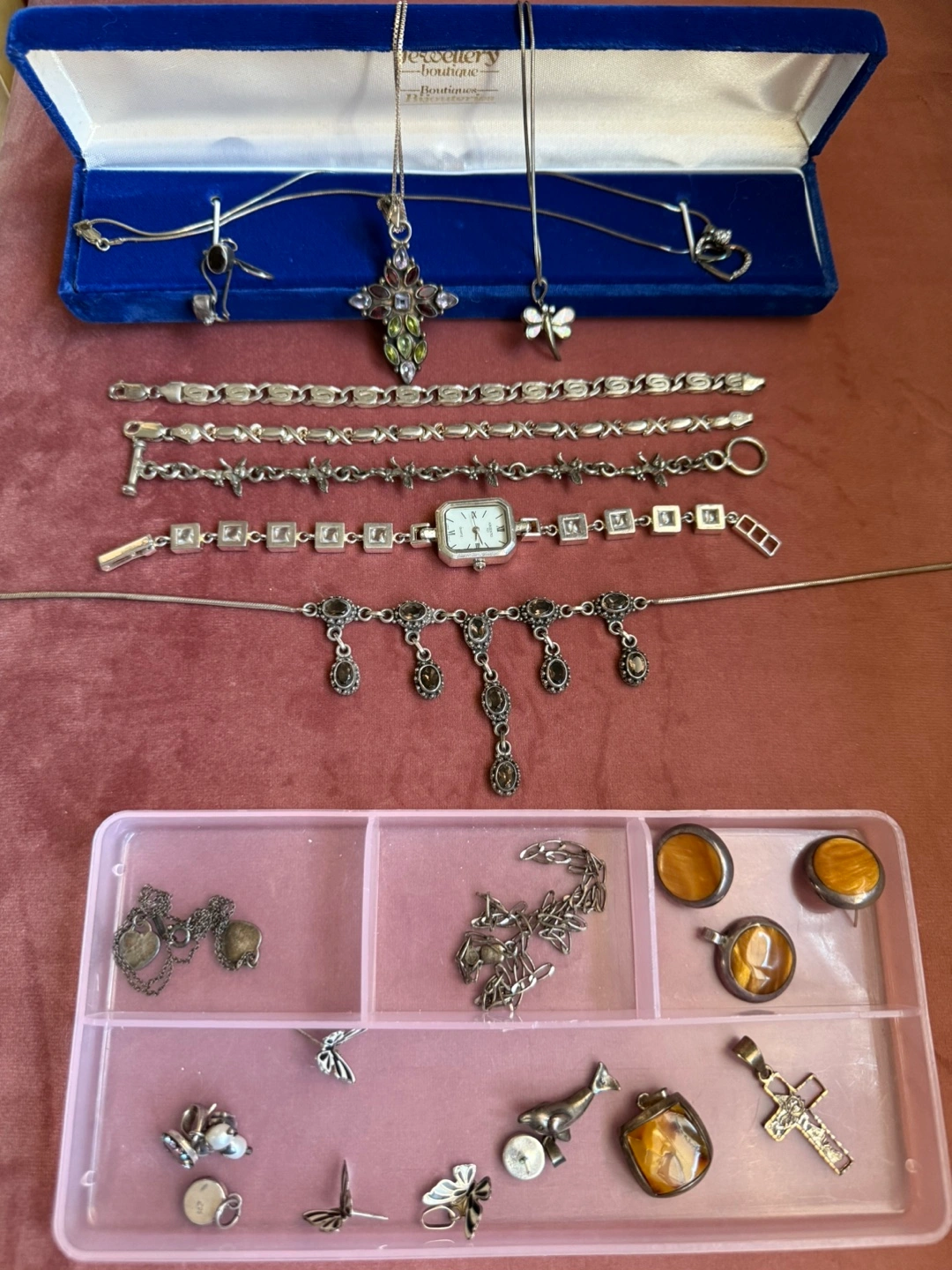 Selling a collection of vintage Argento .925 silver jewelry. Includes necklaces, bracelets, earrings, and pendants in various styles. Some pieces are marked 'MEXICO .925'.