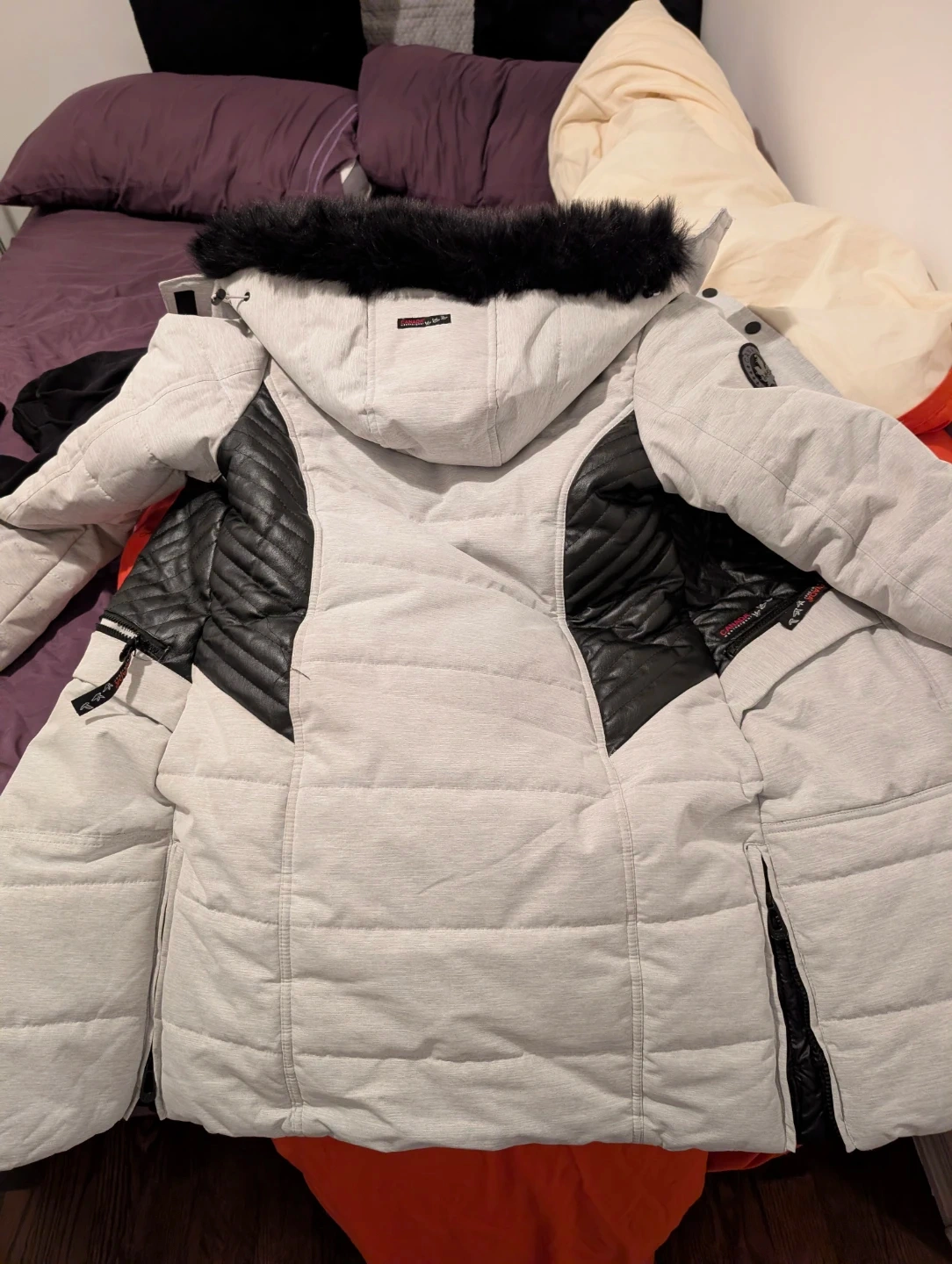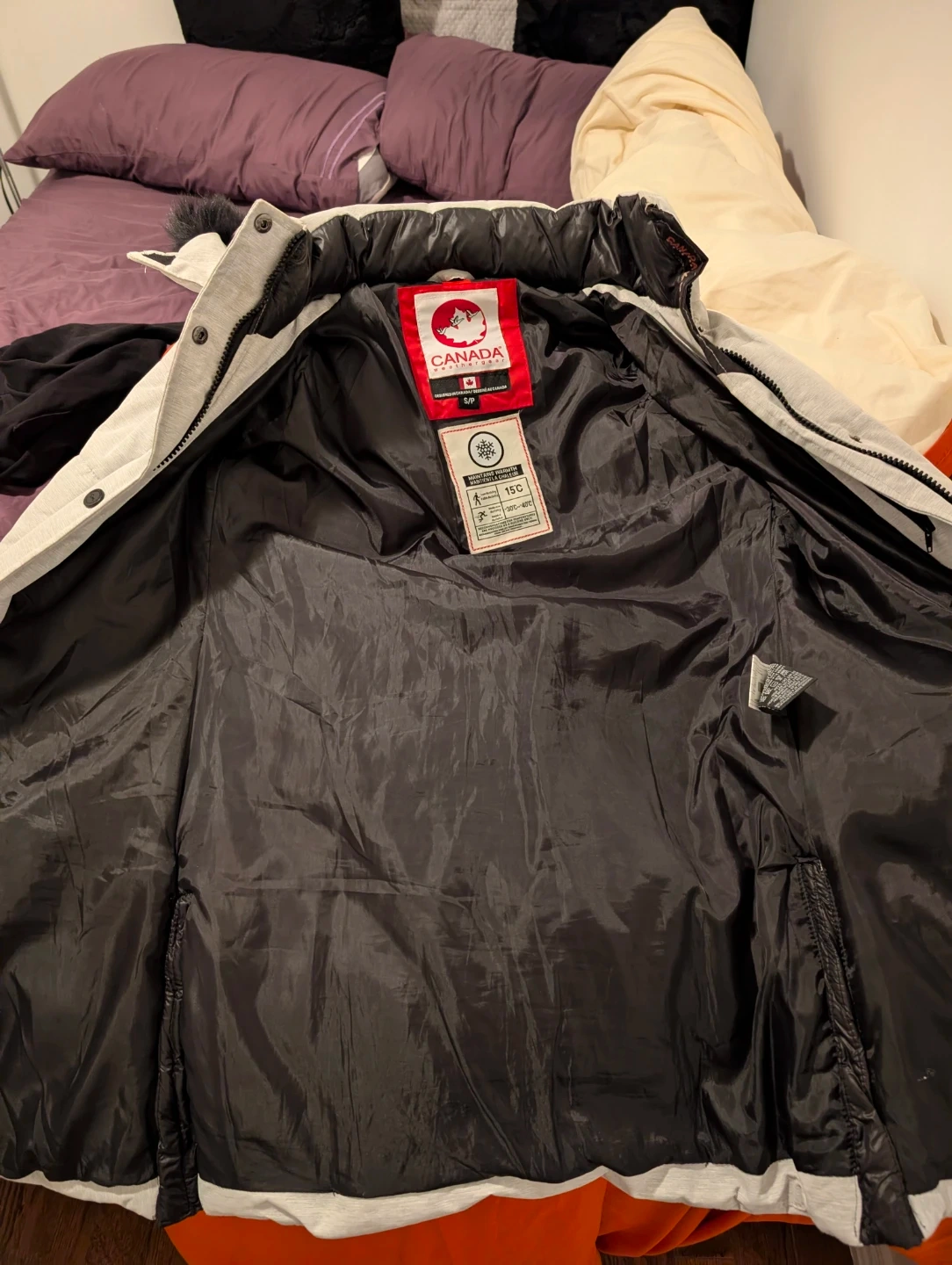 This Canada Weathergear winter coat is designed to maintain warmth. It's a size S/P and features a stylish light grey exterior with black quilted panels. This coat is suitable for keeping warm in colder weather.