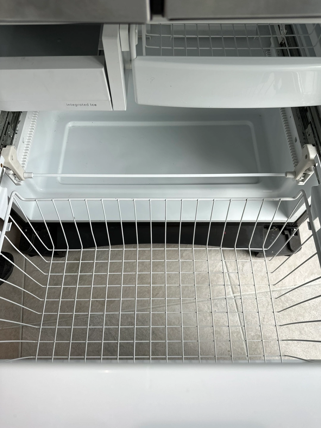 GE French-door refrigerator. Stainless steel finish. Model # GNE22GSBFS. 22.1 cubic feet. Plenty of shelf space. Clean interior. Great condition.