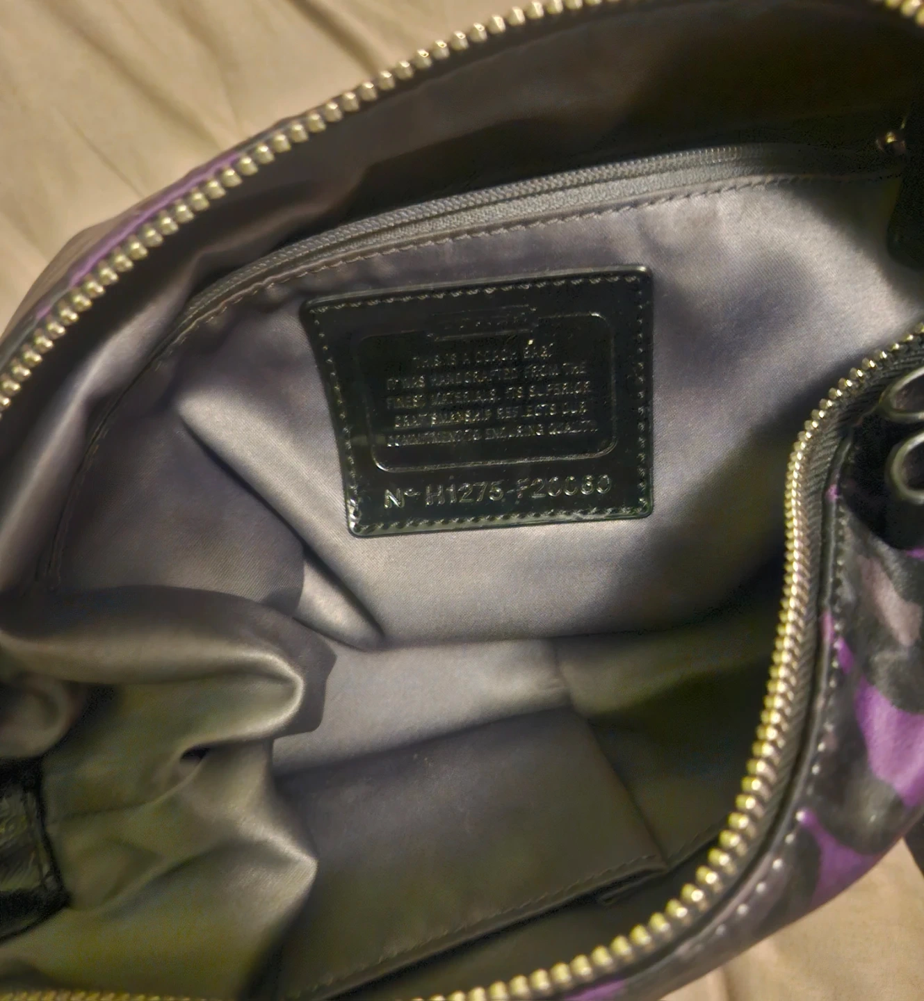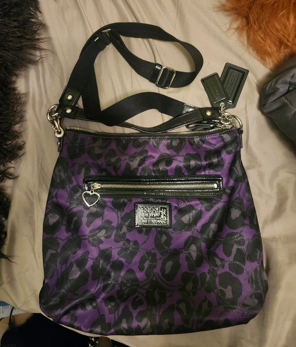 This is a Coach shoulder bag with a vibrant purple and black leopard print. It's made with a durable fabric and features a zippered main compartment and an exterior zippered pocket. The adjustable strap ensures a comfortable fit.