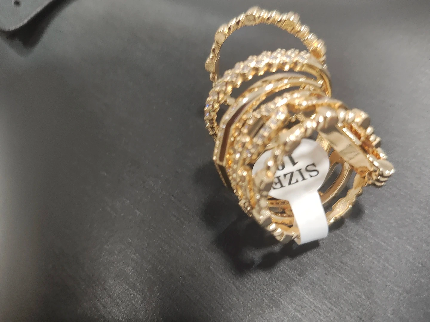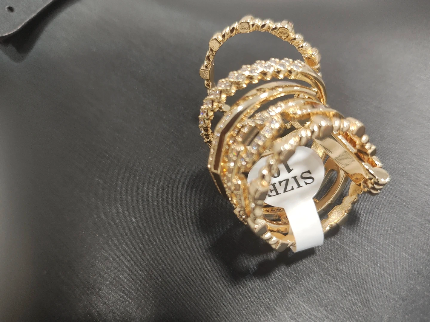 This set includes seven gold-tone stacking rings, many adorned with clear rhinestones. One ring features green accent stones. Sizes are varied for a mixed look. They're great for layering!