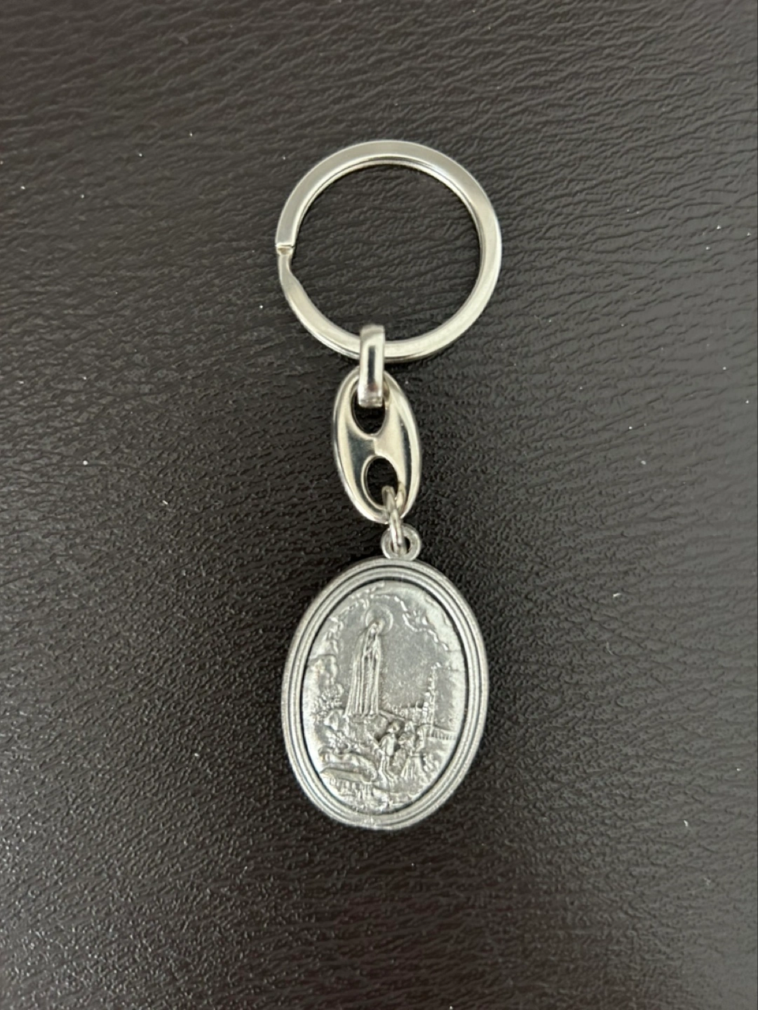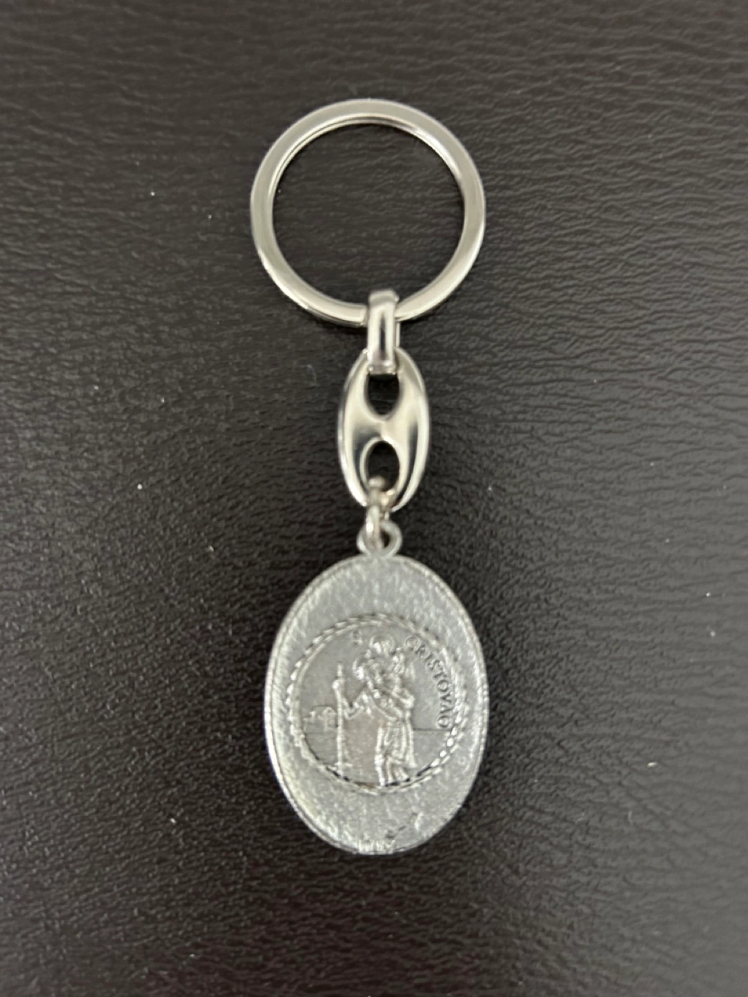 Silver-toned metal keychain. Features an oval medal depicting Saint Christopher. Great for collectors or devotees. The patron of the drivers