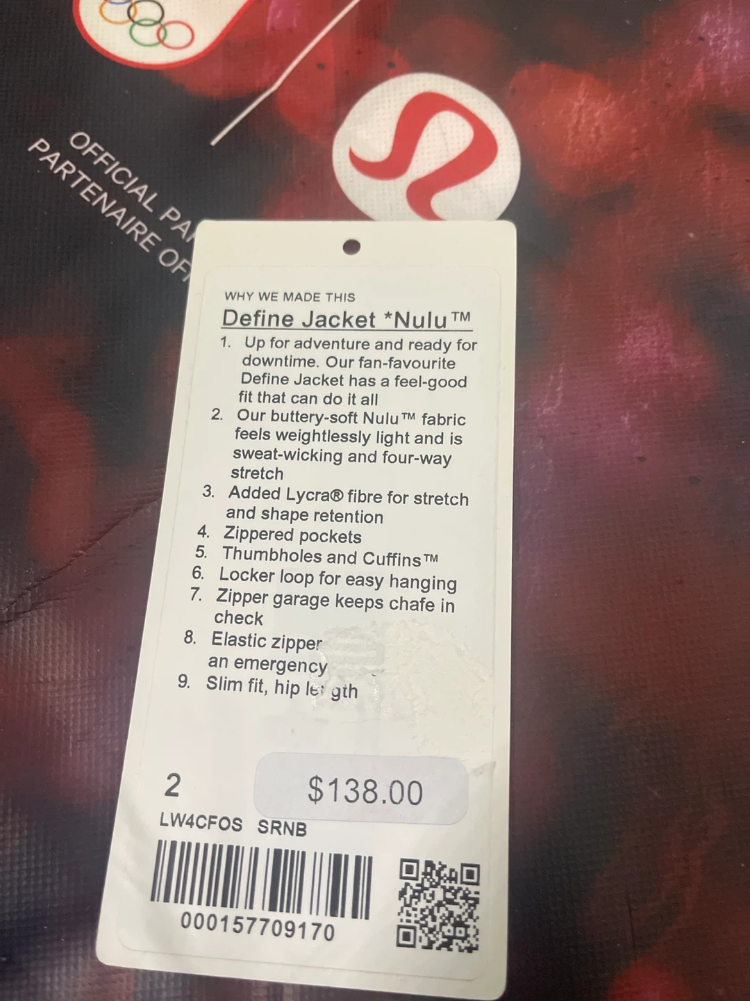 This Lululemon Define Jacket is made with soft Nulu fabric for a lightweight feel. It features Lycra for stretch and shape retention, thumbholes, etc