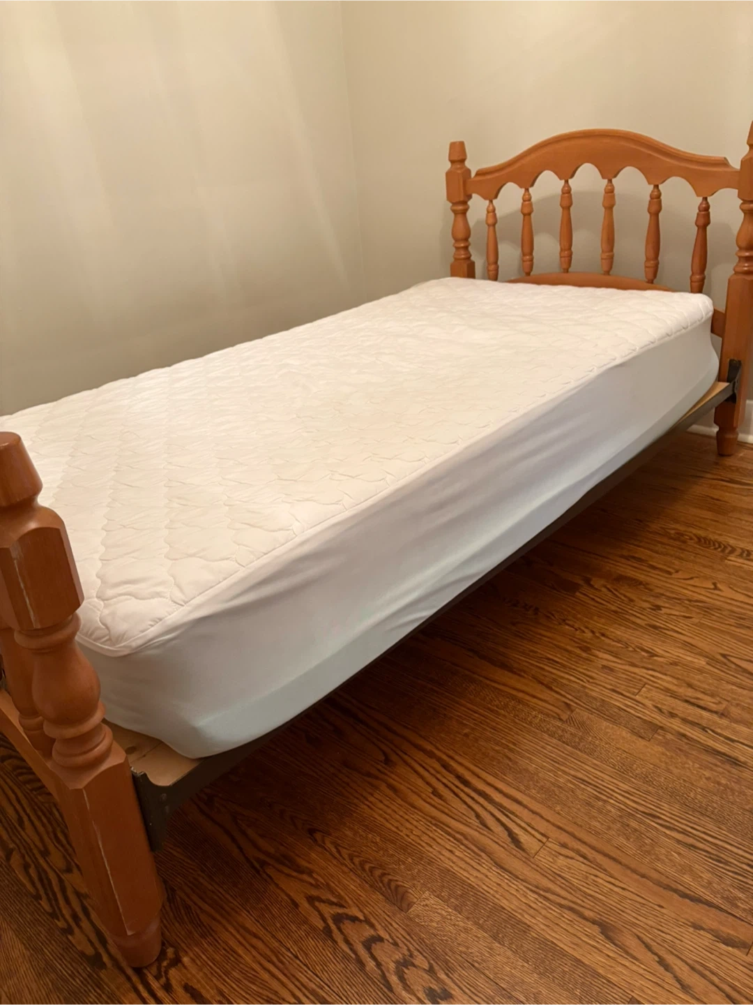 A sturdy vintage twin bed frame made of solid wood with a matching mattress. The frame features a spindle headboard and footboard, perfect for a child's room or guest bedroom. It's a sturdy and simple design. Fairly new mattress included. Guest bedroom hardly see Mattress. Clean, smoke free, Pet free home. Pick up Dufferin/glencairn